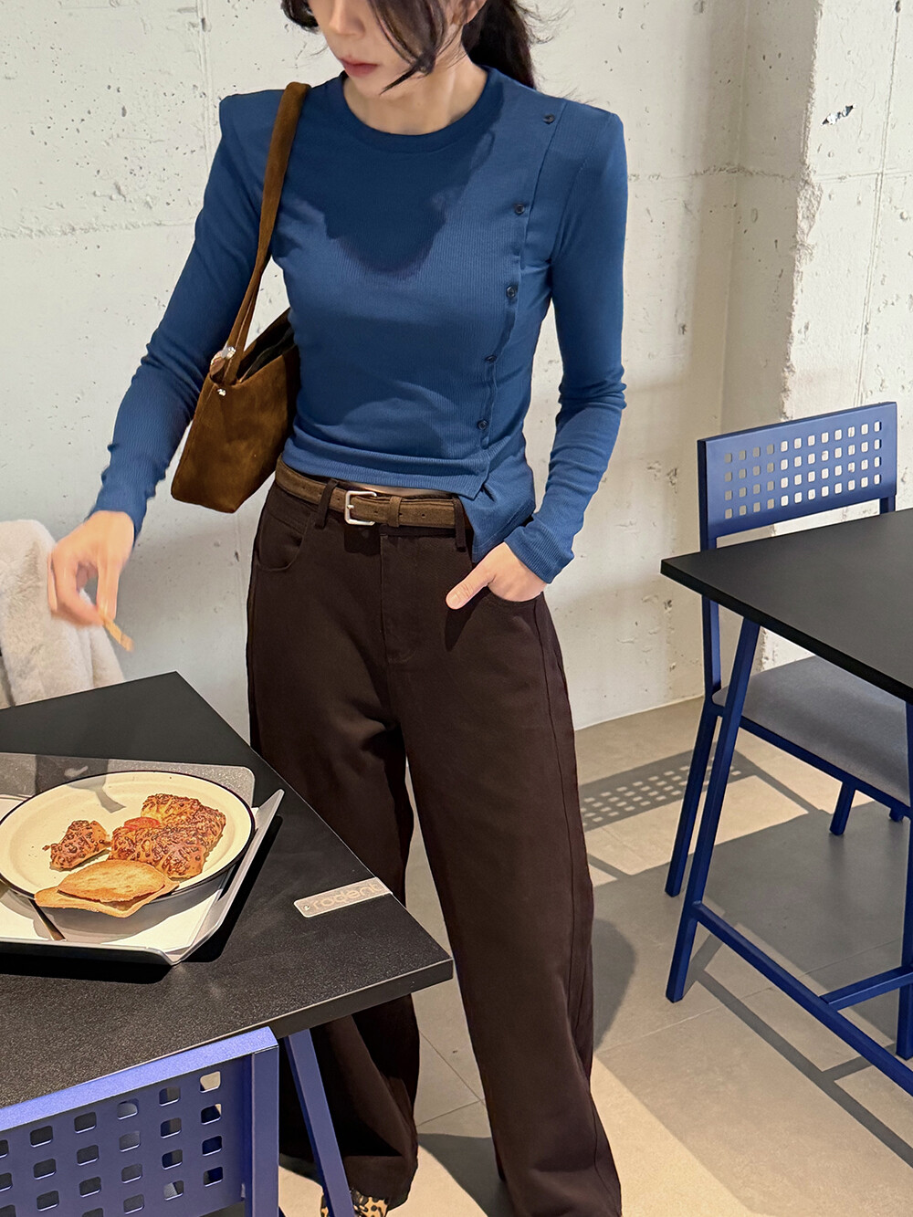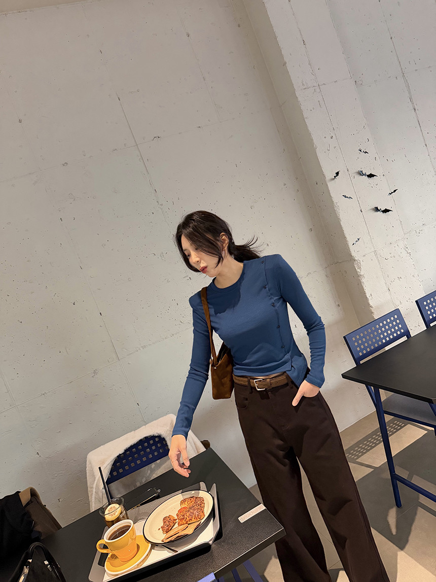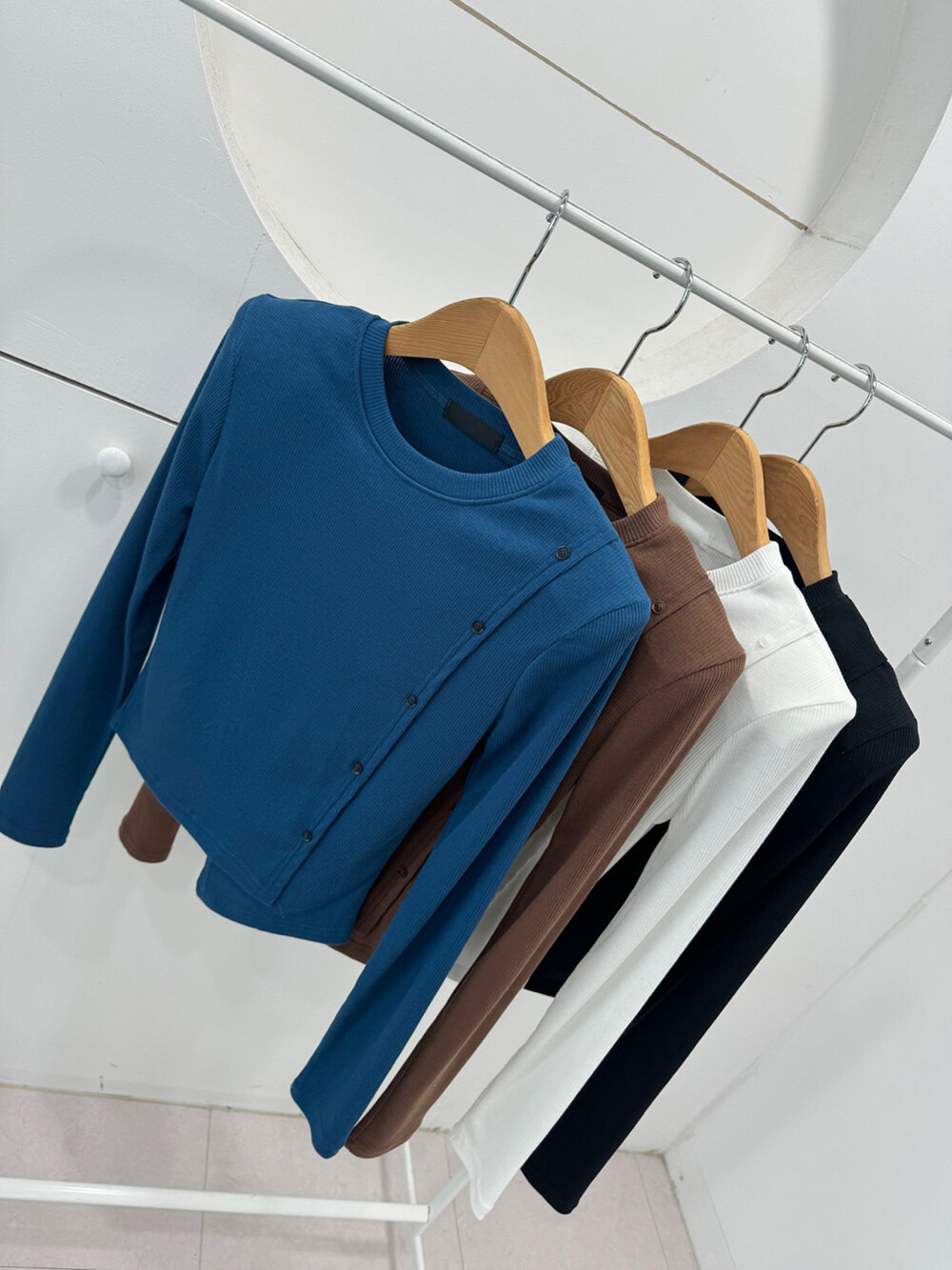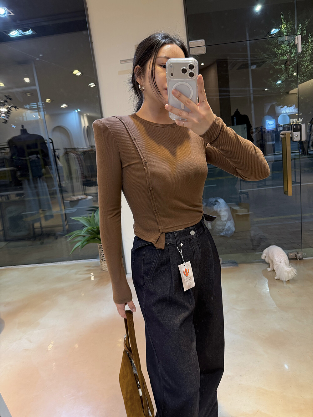 라운드넥라인에 사선으로 단추 포인트 절개 디테일이 들어가 좀 더 날씬해 보이며