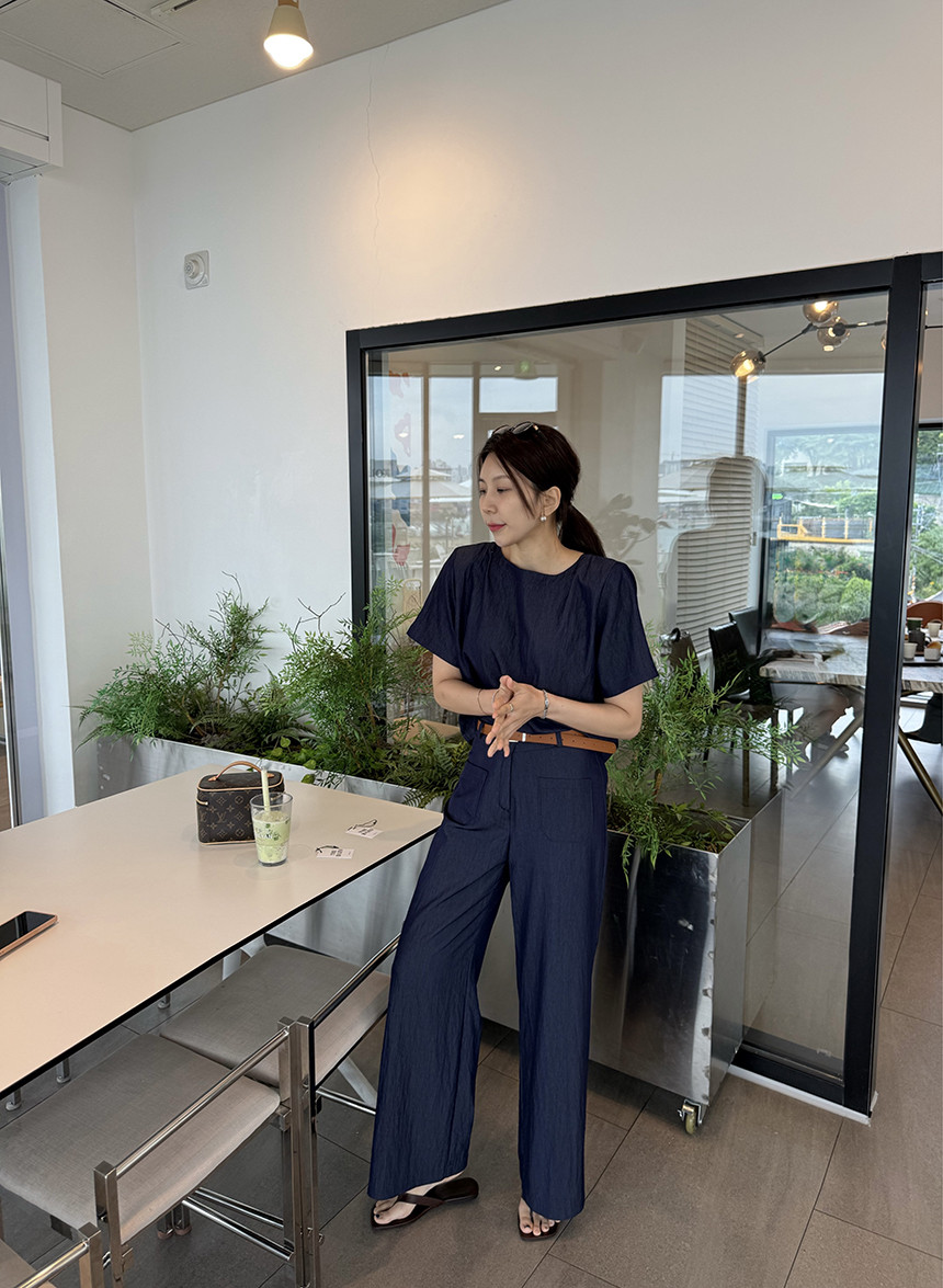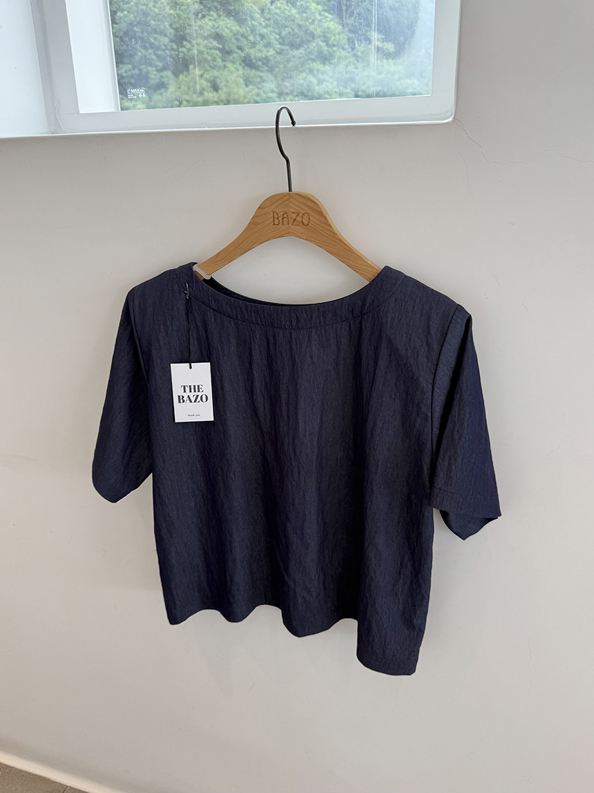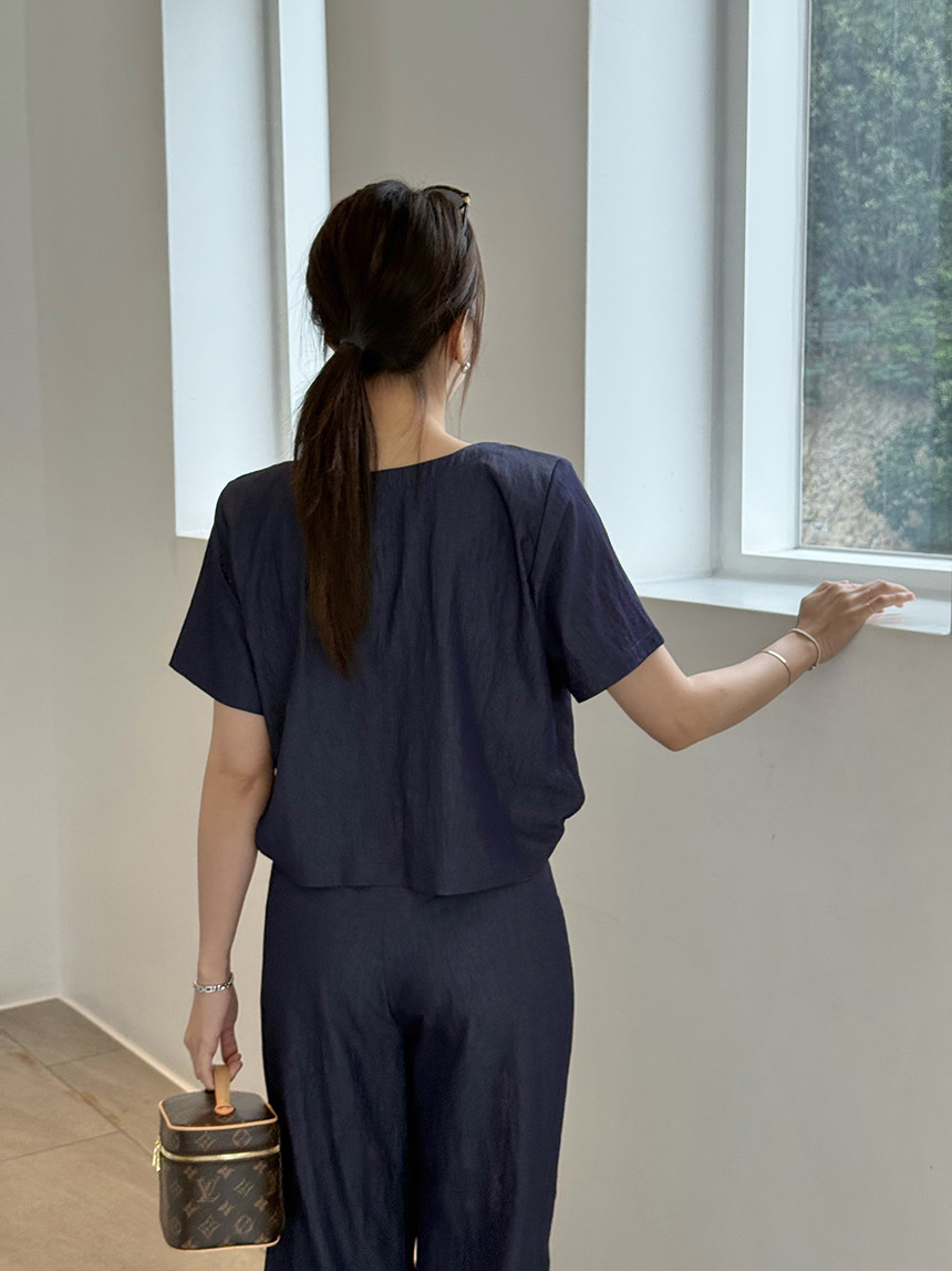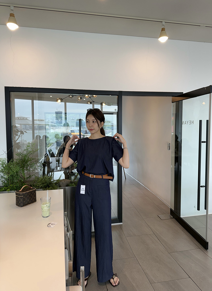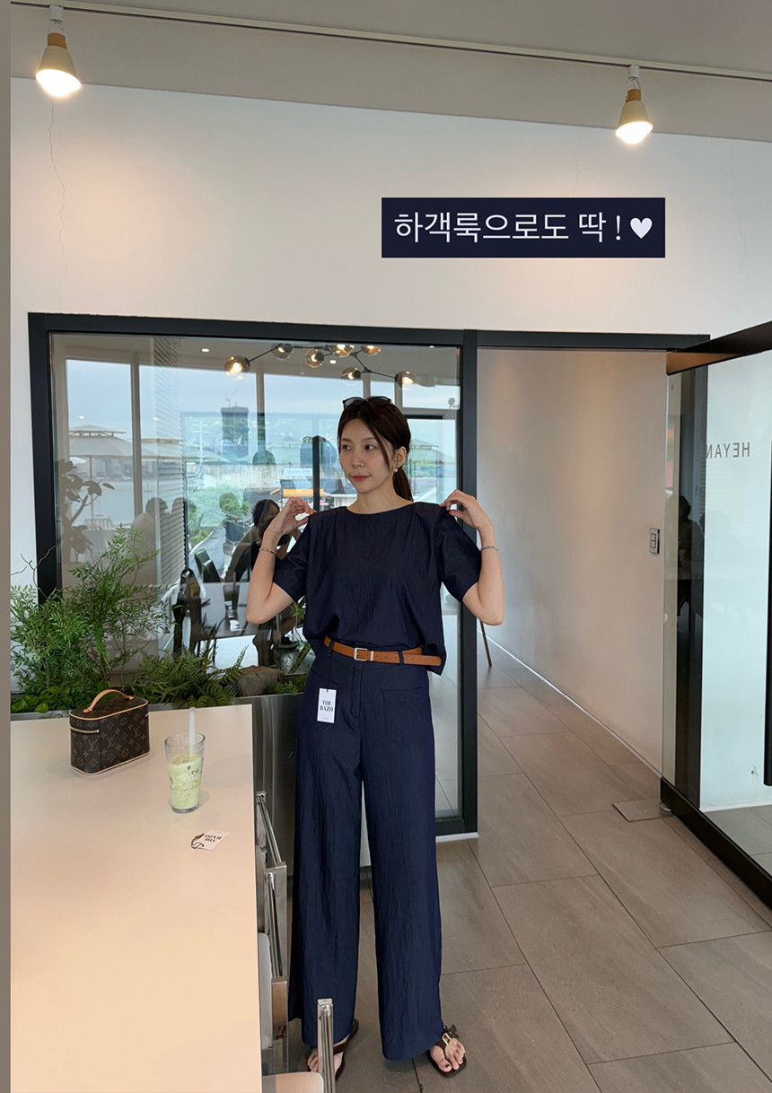 어깨 패드가 포함 된 세미 크롭 기장의 반팔 블라우스예요