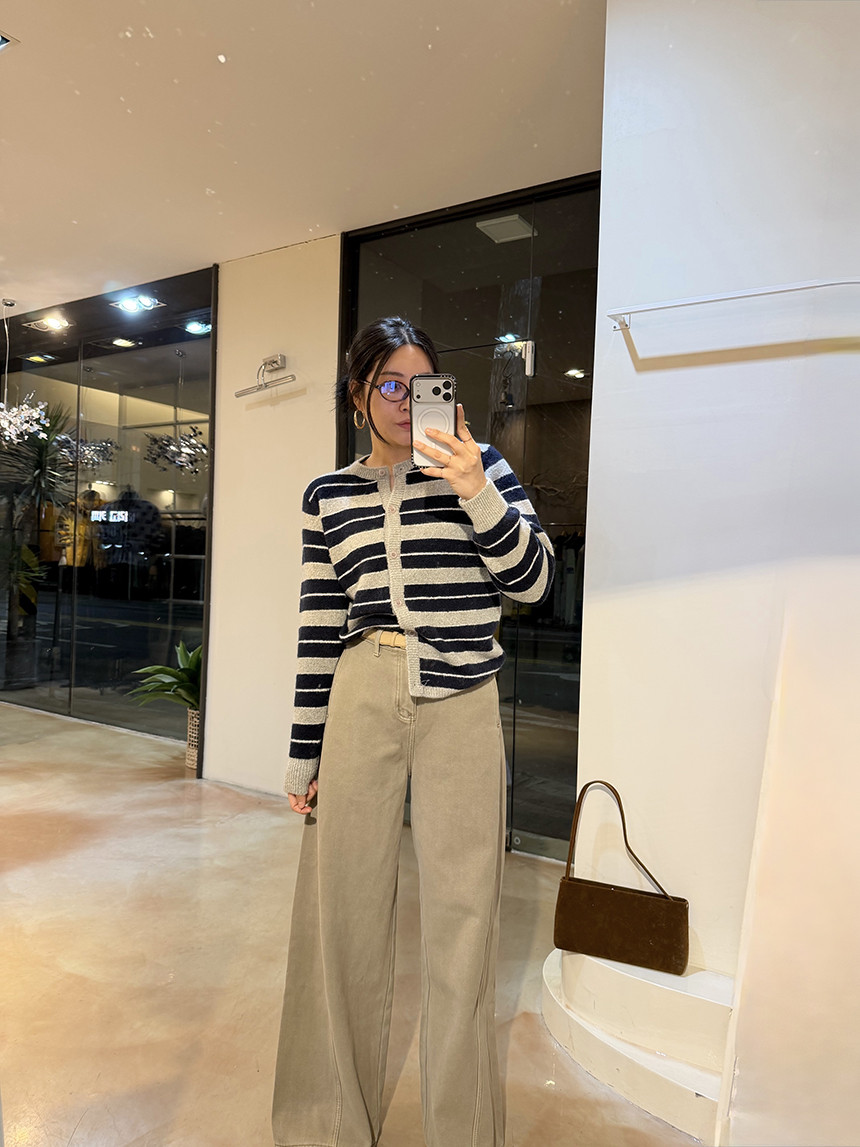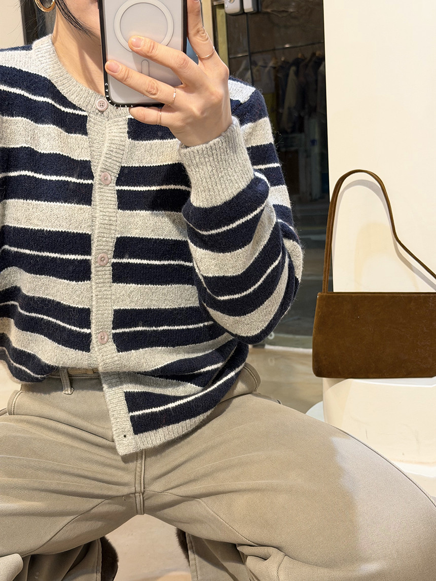컬러 배색이 돋보이는 단가라 니트 가디건으로 단정하게