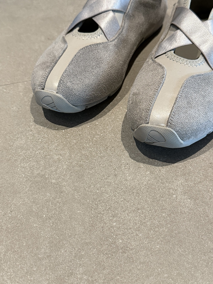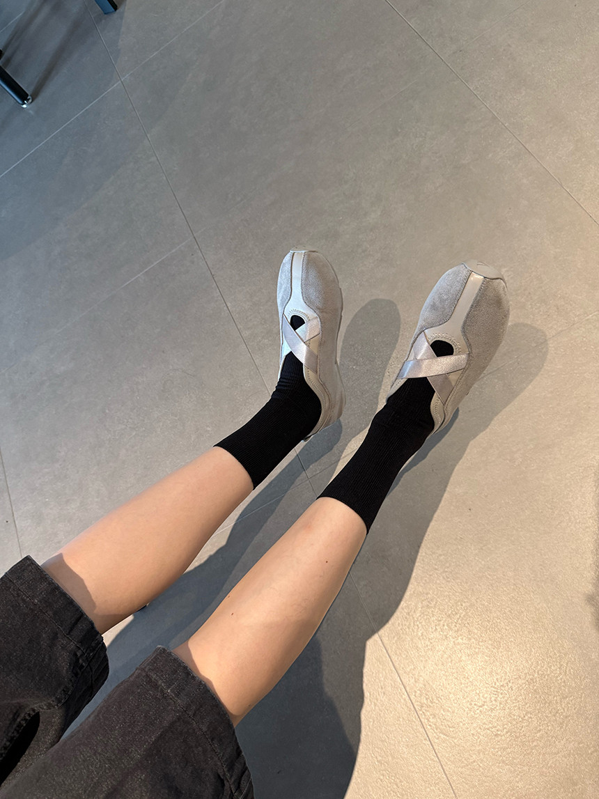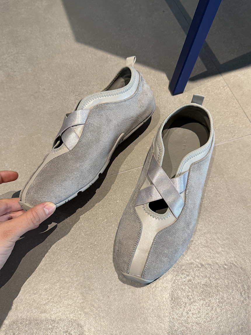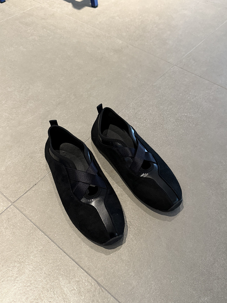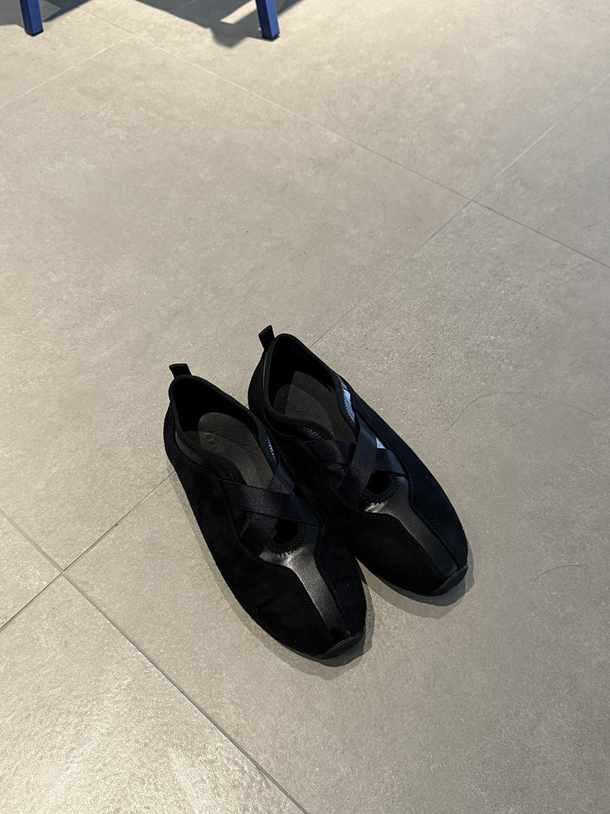 -크로스 밴딩으로 신고 벗기 편안함 -여성스러운 발레코어룩 느낌 연출가능 -푹신한 쿠션감 -안정감 있는 미끄럼 방지 밑창 -고급스러운 스웨이드 소재