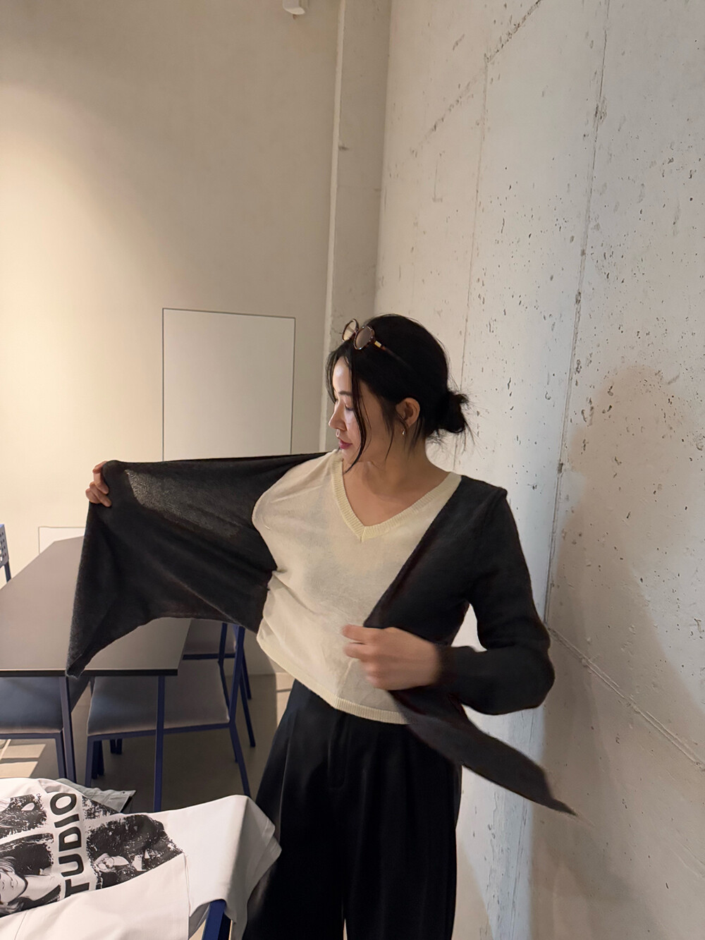 가디건과 티셔츠가 붙어있는 올인원 스타일로 하나만 입어도 코디 끝이예요