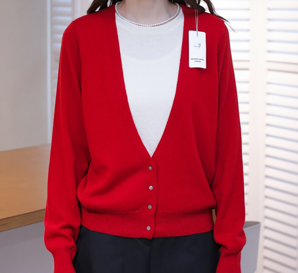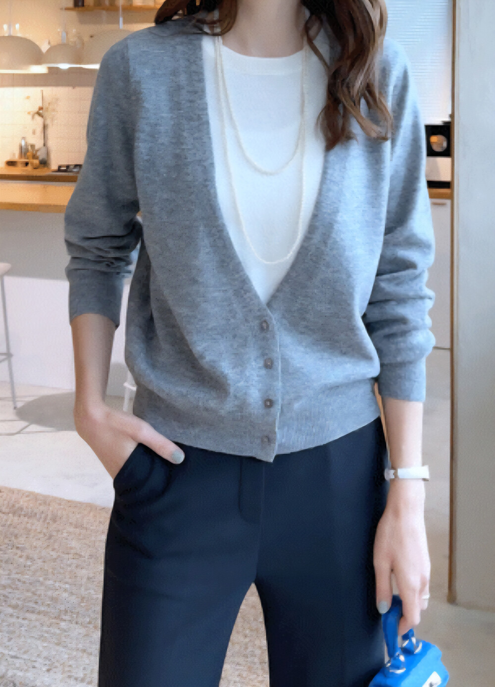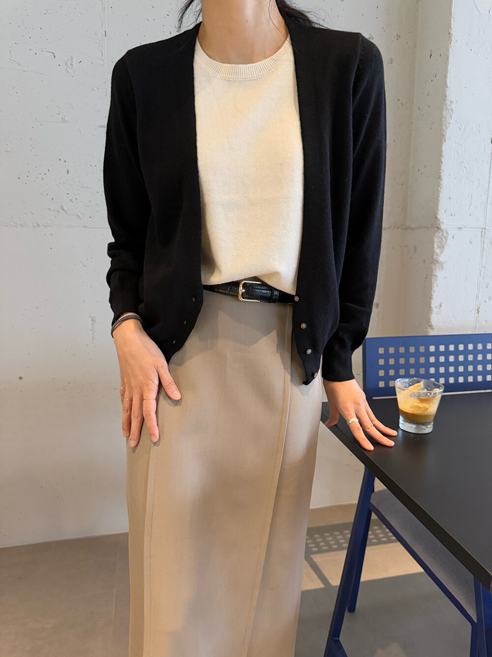 [디테일] 자개단추로 깔끔한 무드 가디건 넥라인이 깊에 파여 날씬해보이는 효과