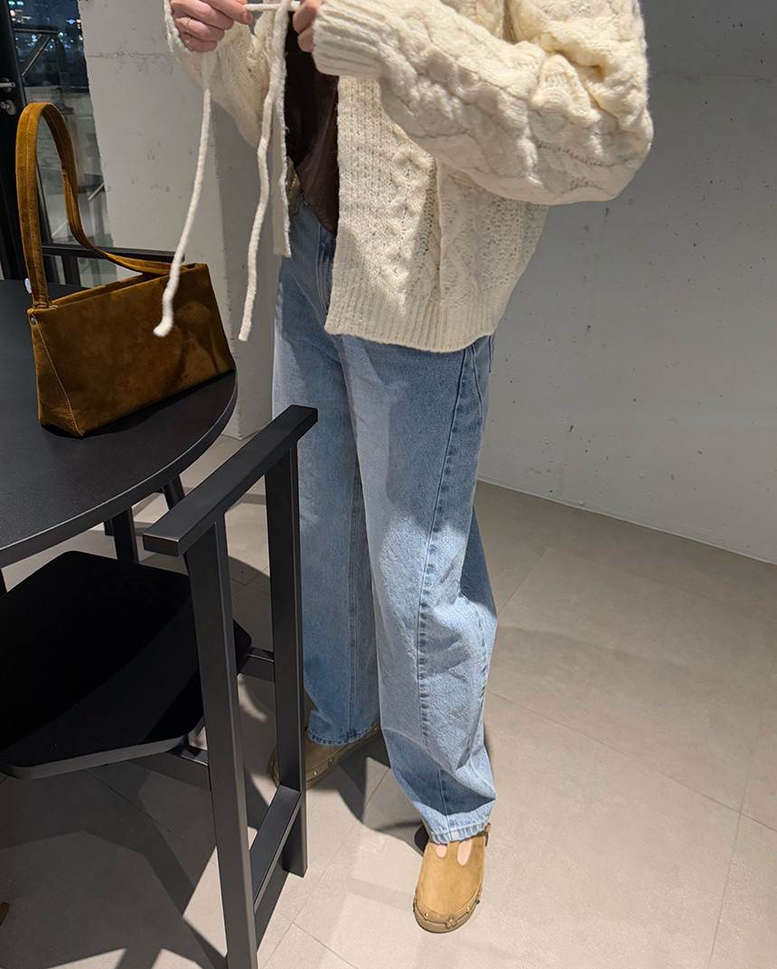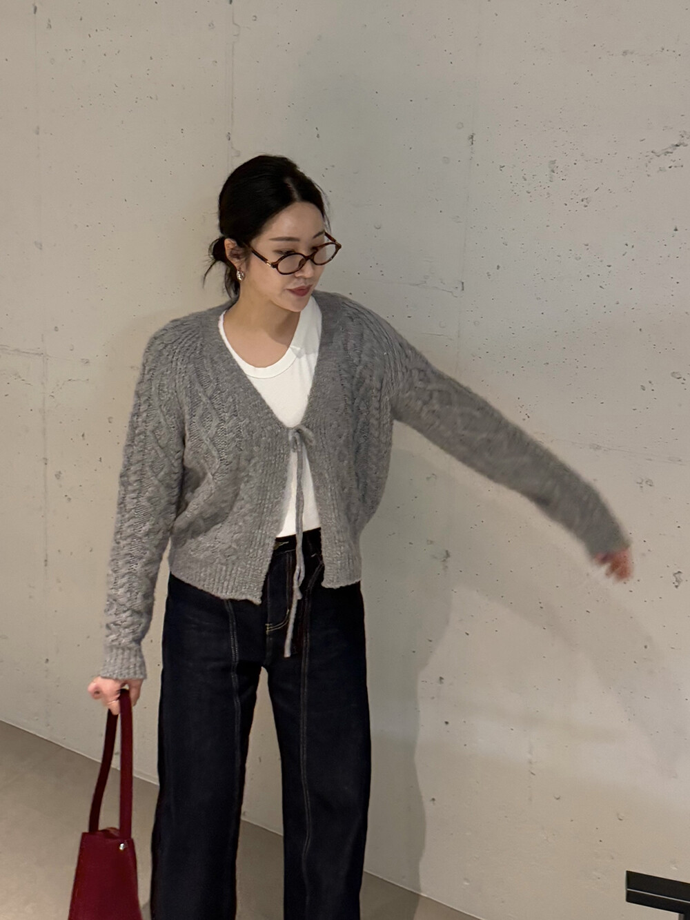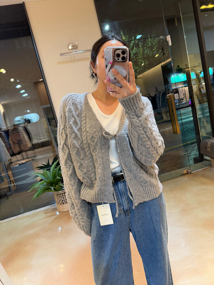 [디자인] 피셔 짜임에 앞 중심 리본 디테일의 루즈핏 가디건