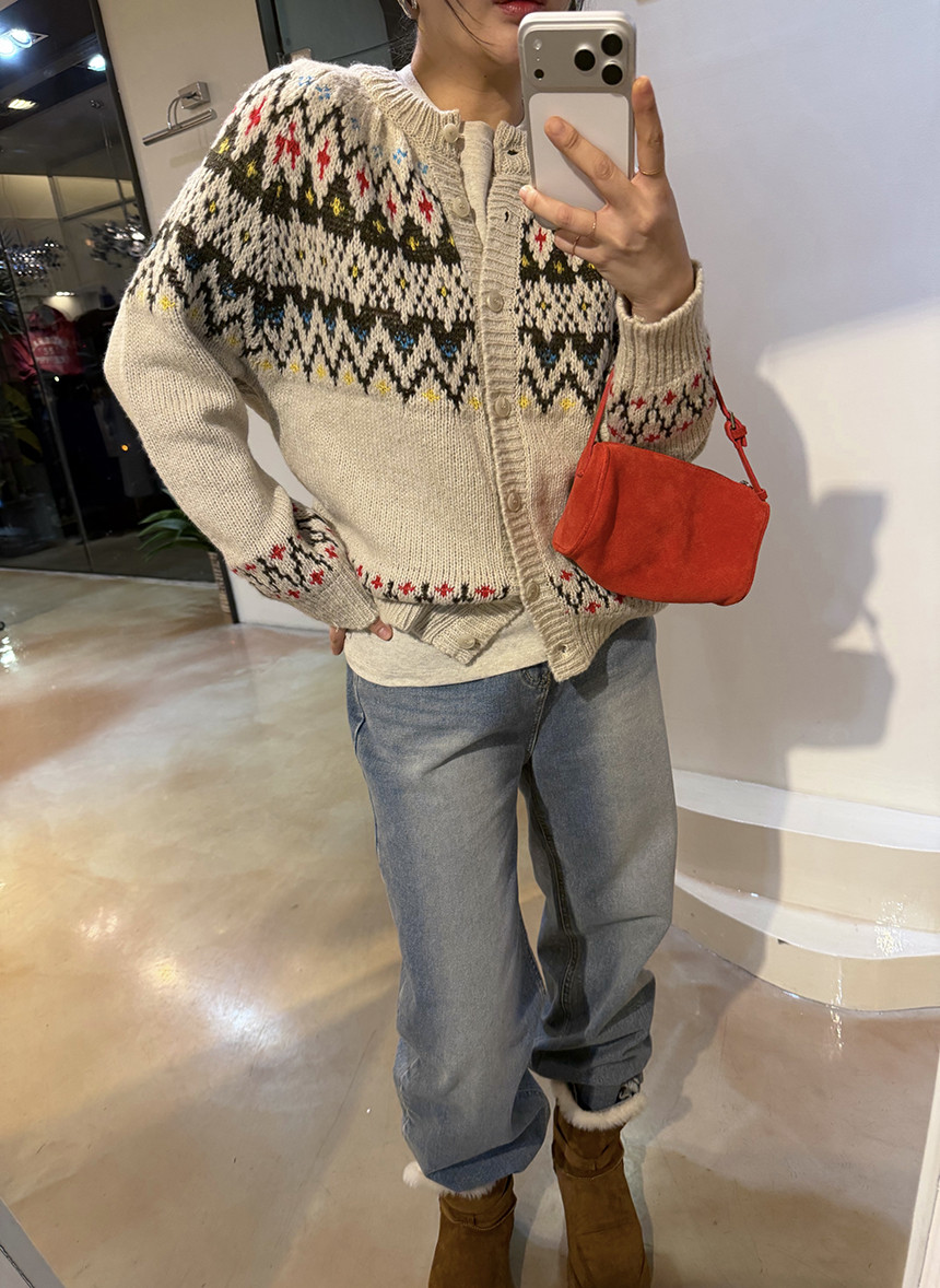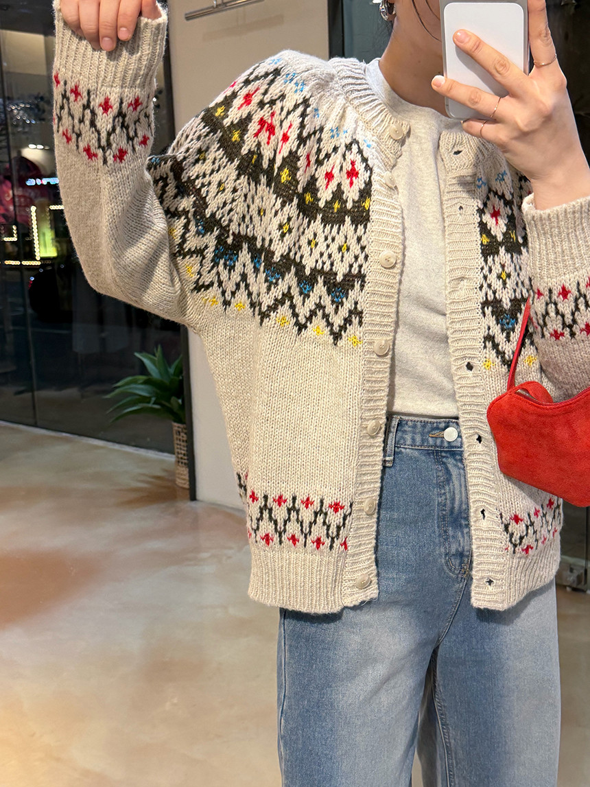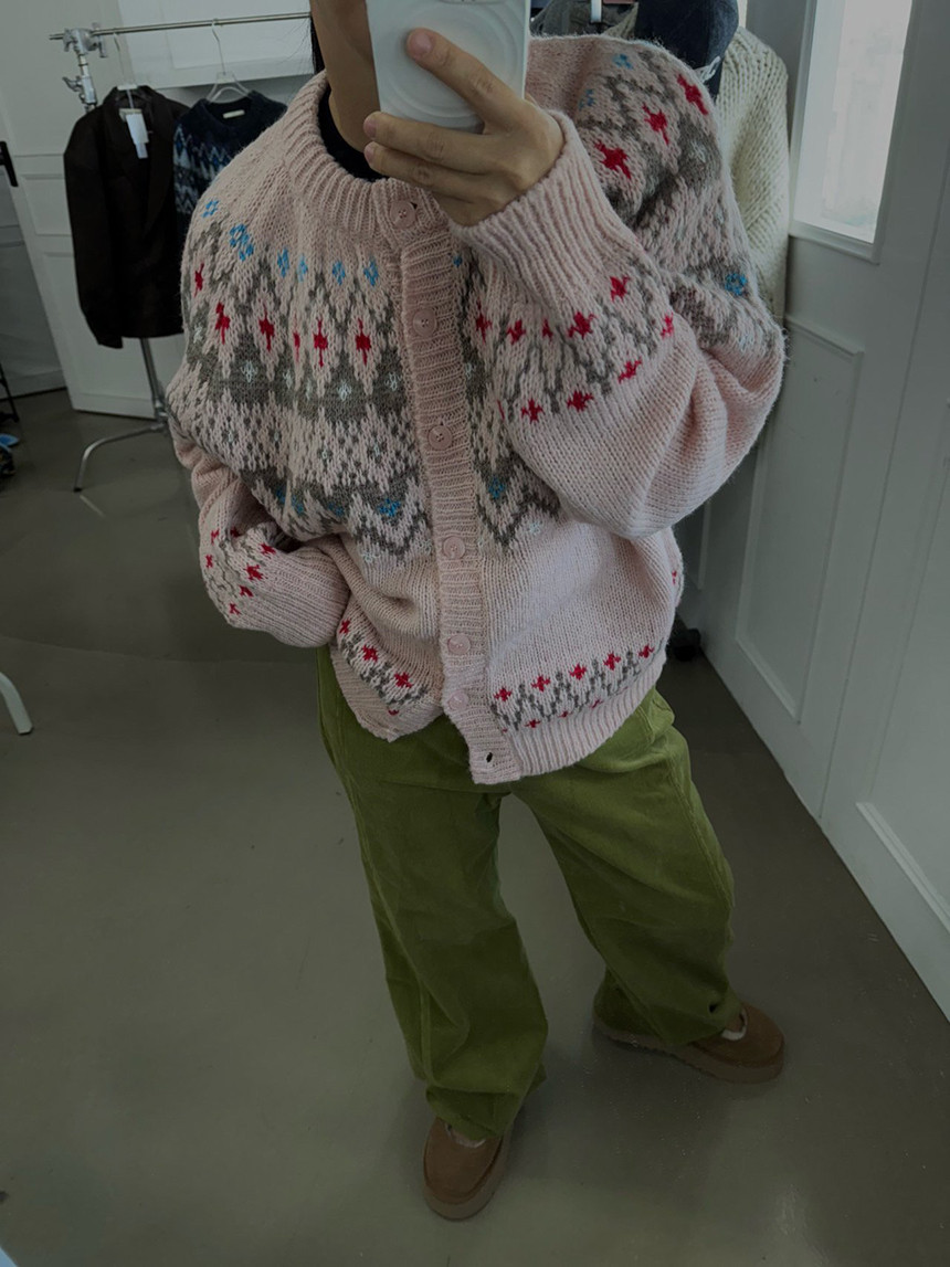 노르닉 패턴의 빈티지한 니트가디건 루즈핏으로 체형 커버되며 여리한 느낌