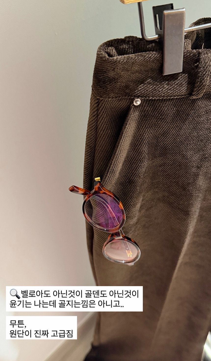 이 바지의 킥은 원단! 매끈하니 스판끼있고 골덴? 벨로아? 의 중간 느낌