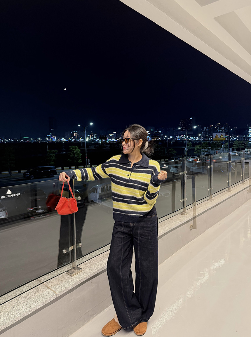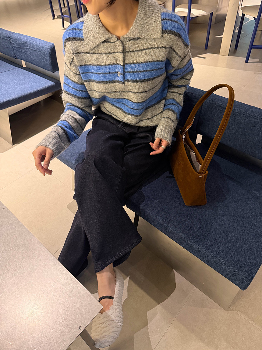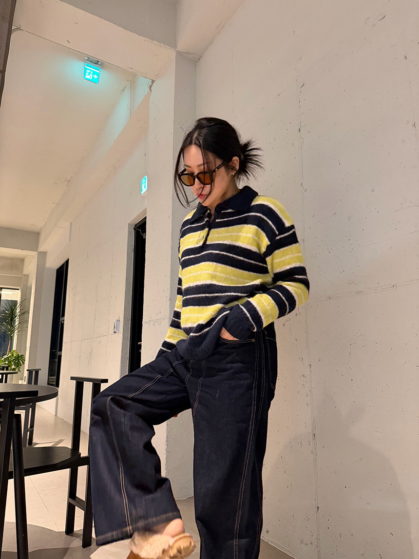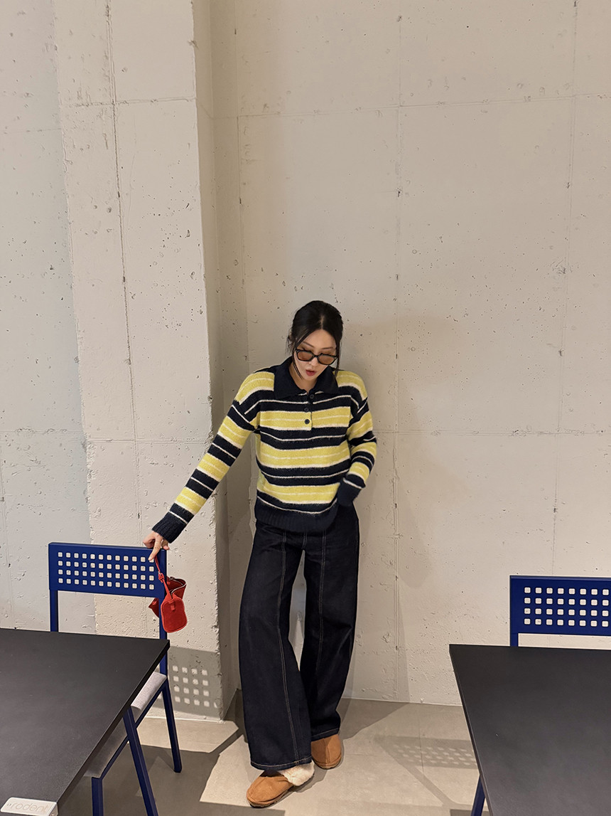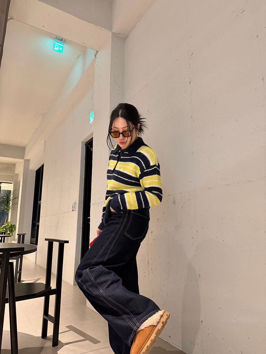 얼굴이 작아보이는 카라 니트 티셔츠에 배색 스트라이프로
