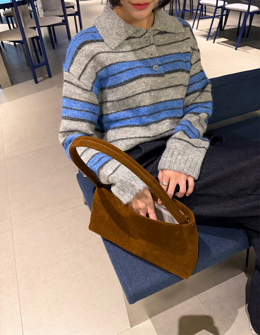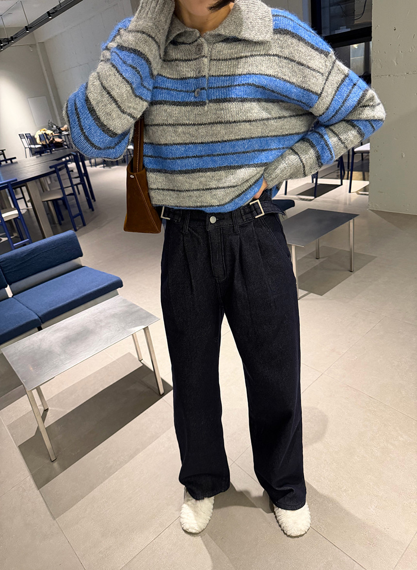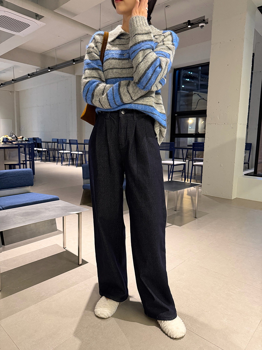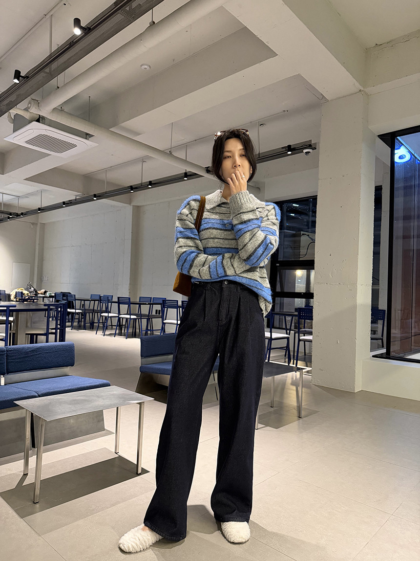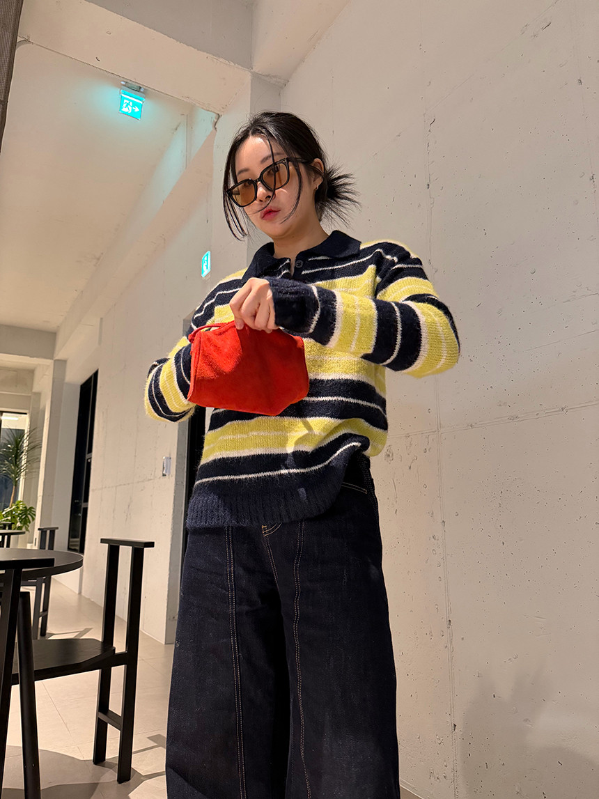 얼굴이 작아보이는 카라 니트 티셔츠에 배색 스트라이프로