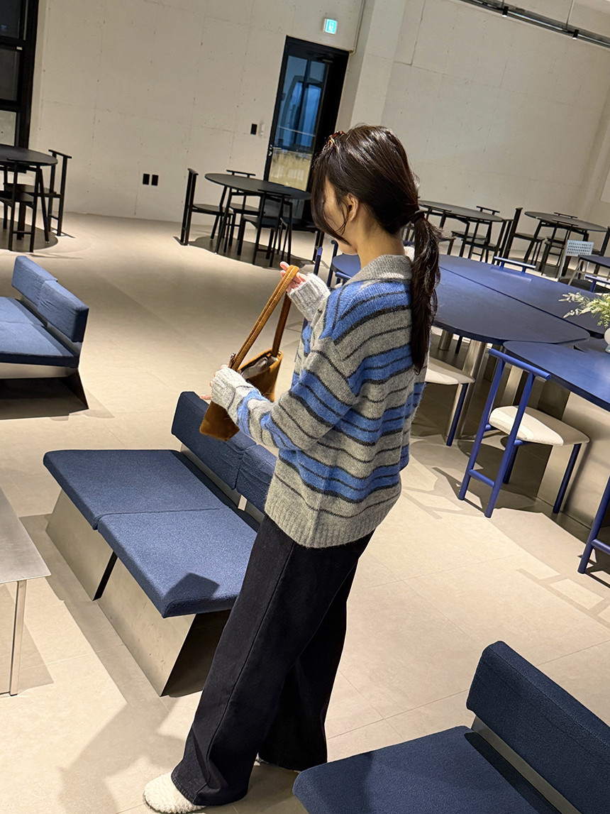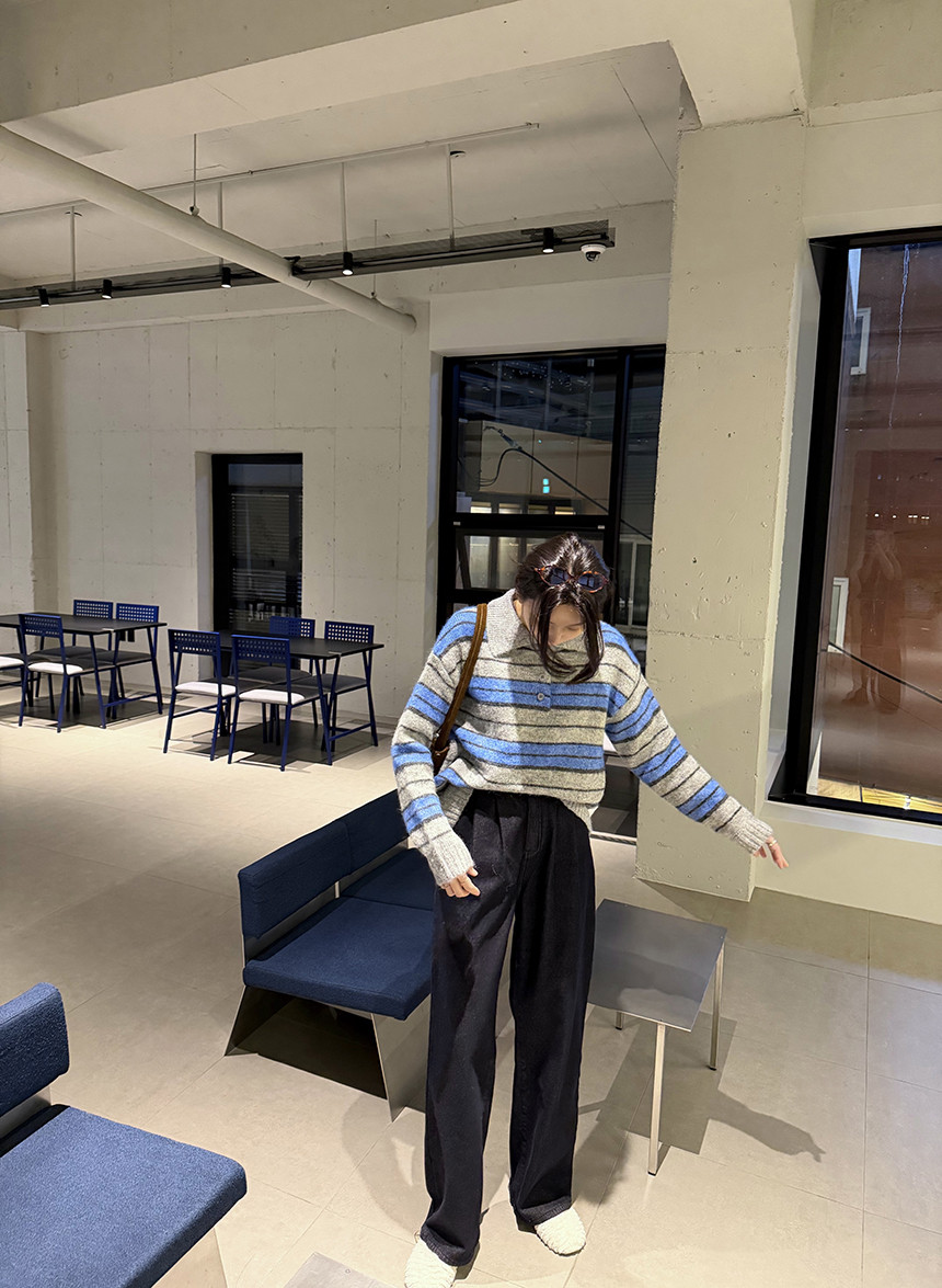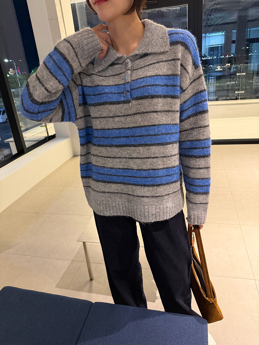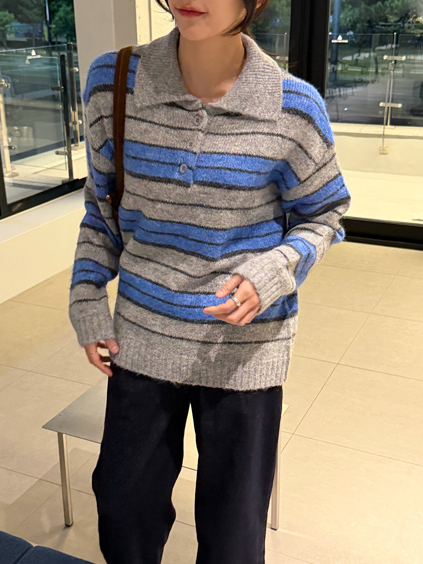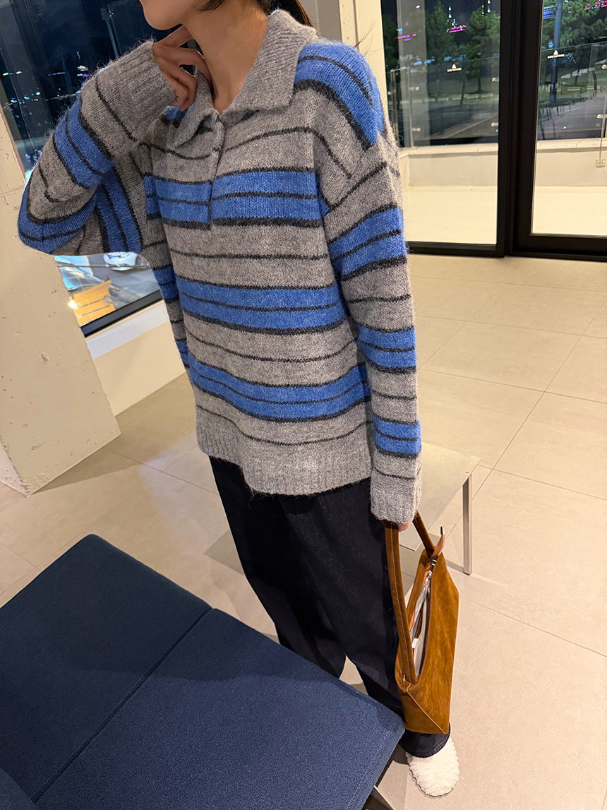 유니섹스- 커플템으로도 추천!! 존재감 확실한 배색 스프라이프 패턴의 카라 니트