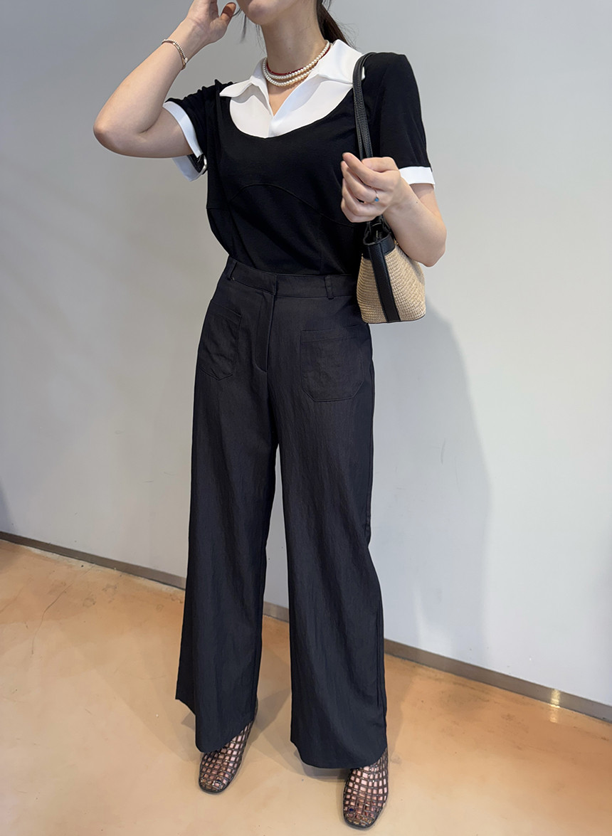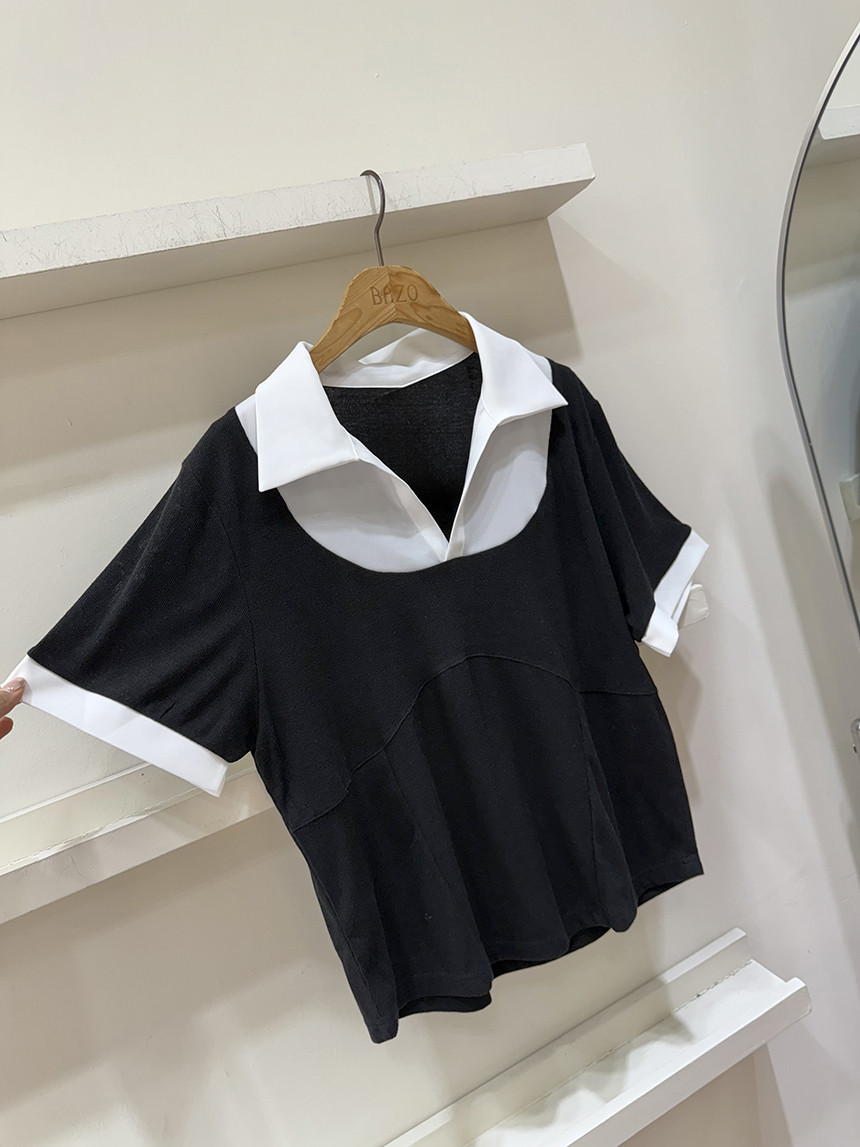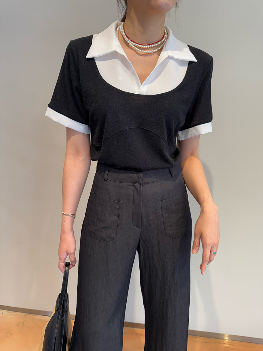 클래식 무드의 레이어드 한 것 같은 배색 카라 티셔츠-