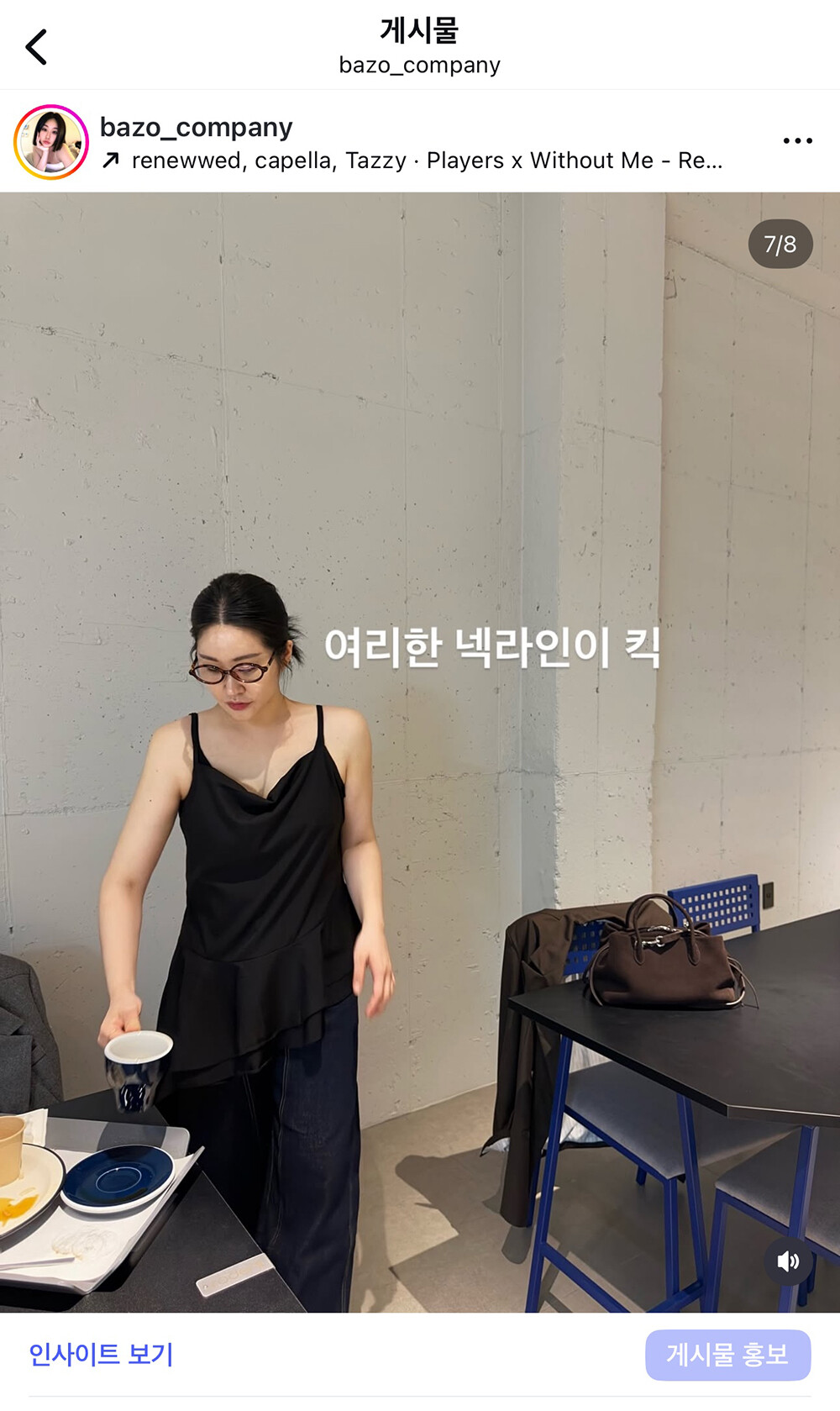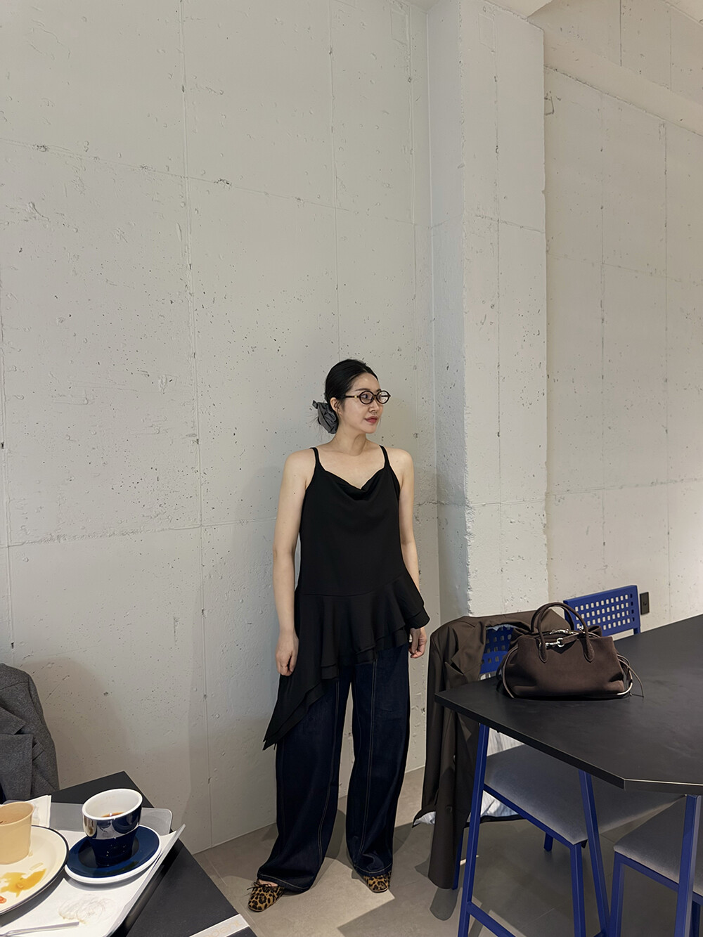 [디테일] 밑단 사선 언발로 떨어져 분위기 있는 무드 연출 핏 조절 가능한 어깨끈 드레이프지게 떨어지는 여리한 넥라인