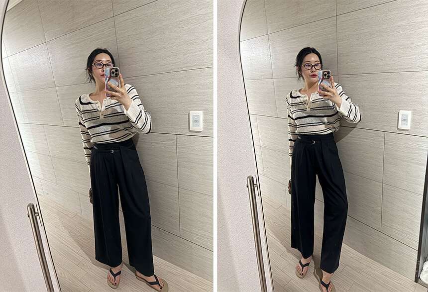 [디자인&핏] -뒷밴딩 프리사이즈의 팬츠로 모던한 세미라인의 슬랙스 -벨트 세트로 클래식한 코디완성 -앞 뒤쪽으로 다트턱을 주어 입체적인 실루엣의 고퀄리티 디자인 -하이웨스트 밑위 기장 높게 나와 다리가 길어이며 체형커버 되는 디자인