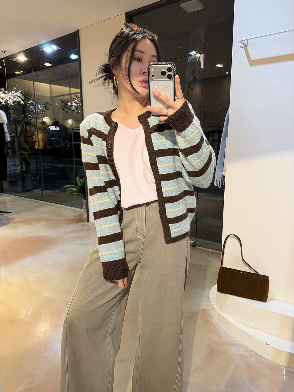 컬러 배색이 돋보이는 단가라 니트 가디건으로 단정하게