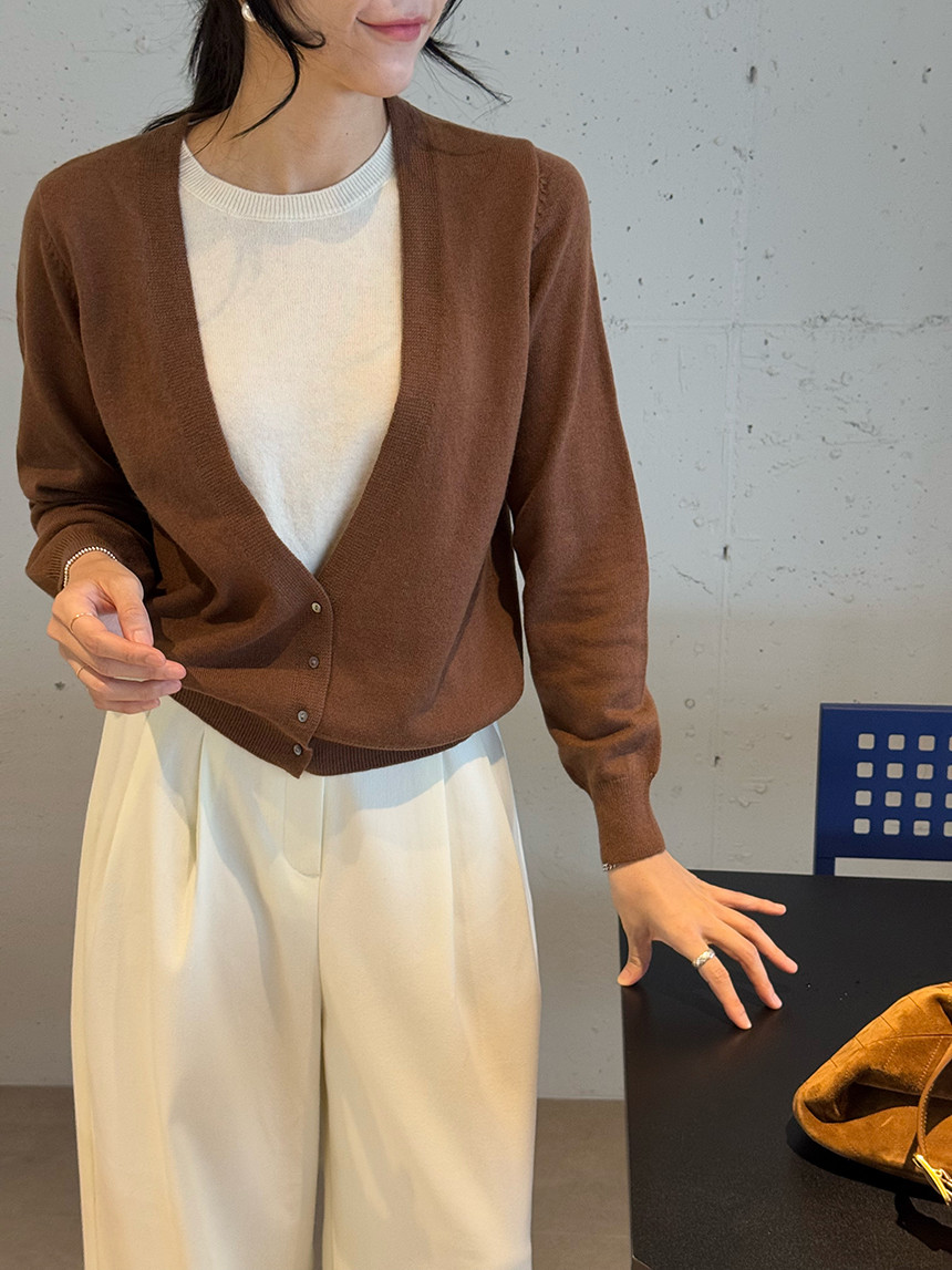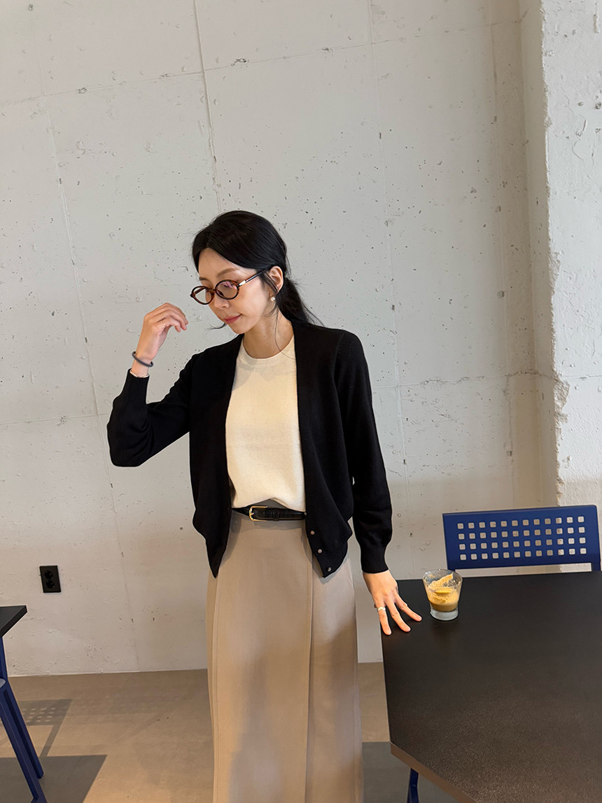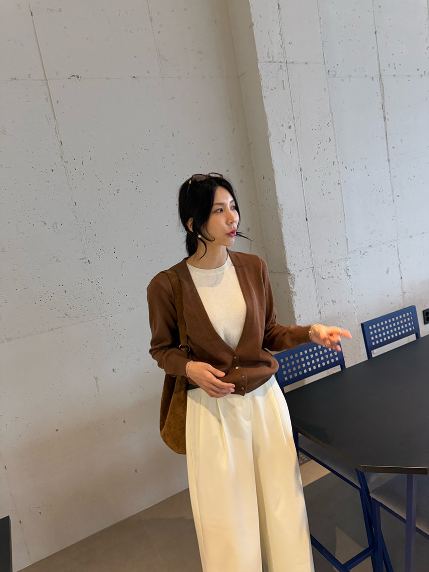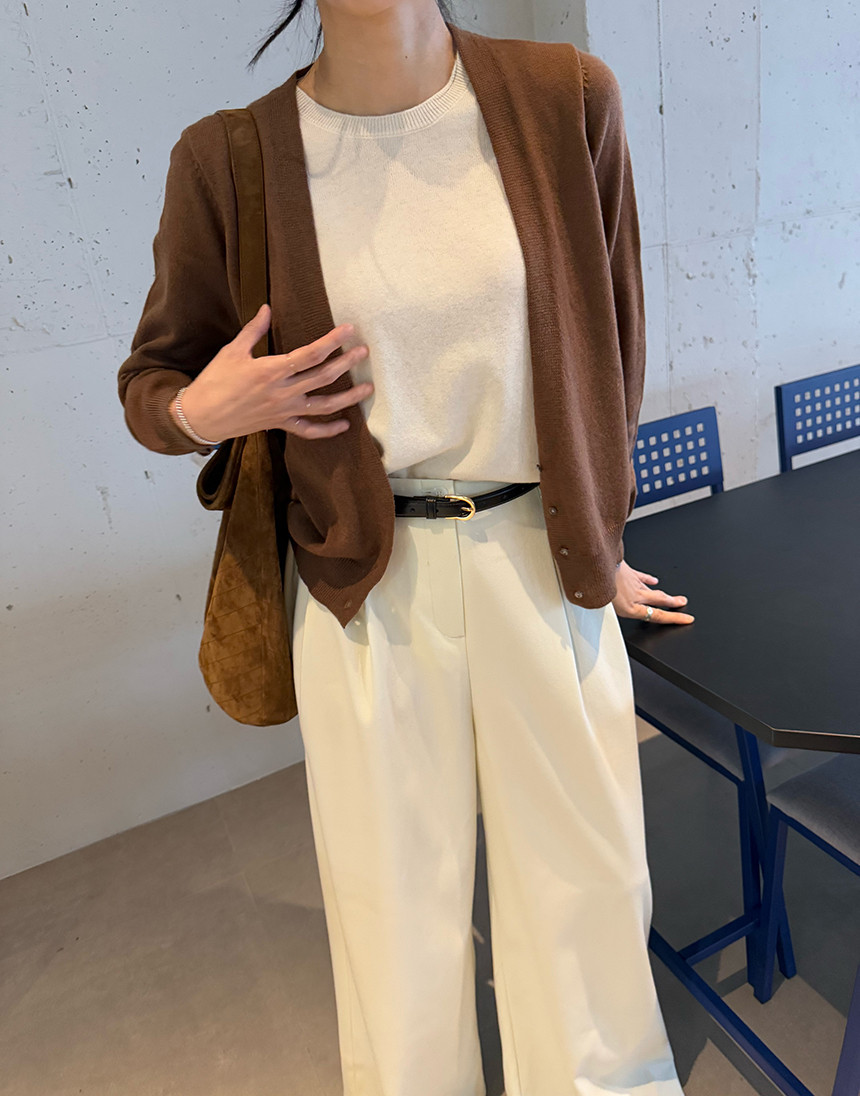 [디테일] 자개단추로 깔끔한 무드 가디건 넥라인이 깊에 파여 날씬해보이는 효과