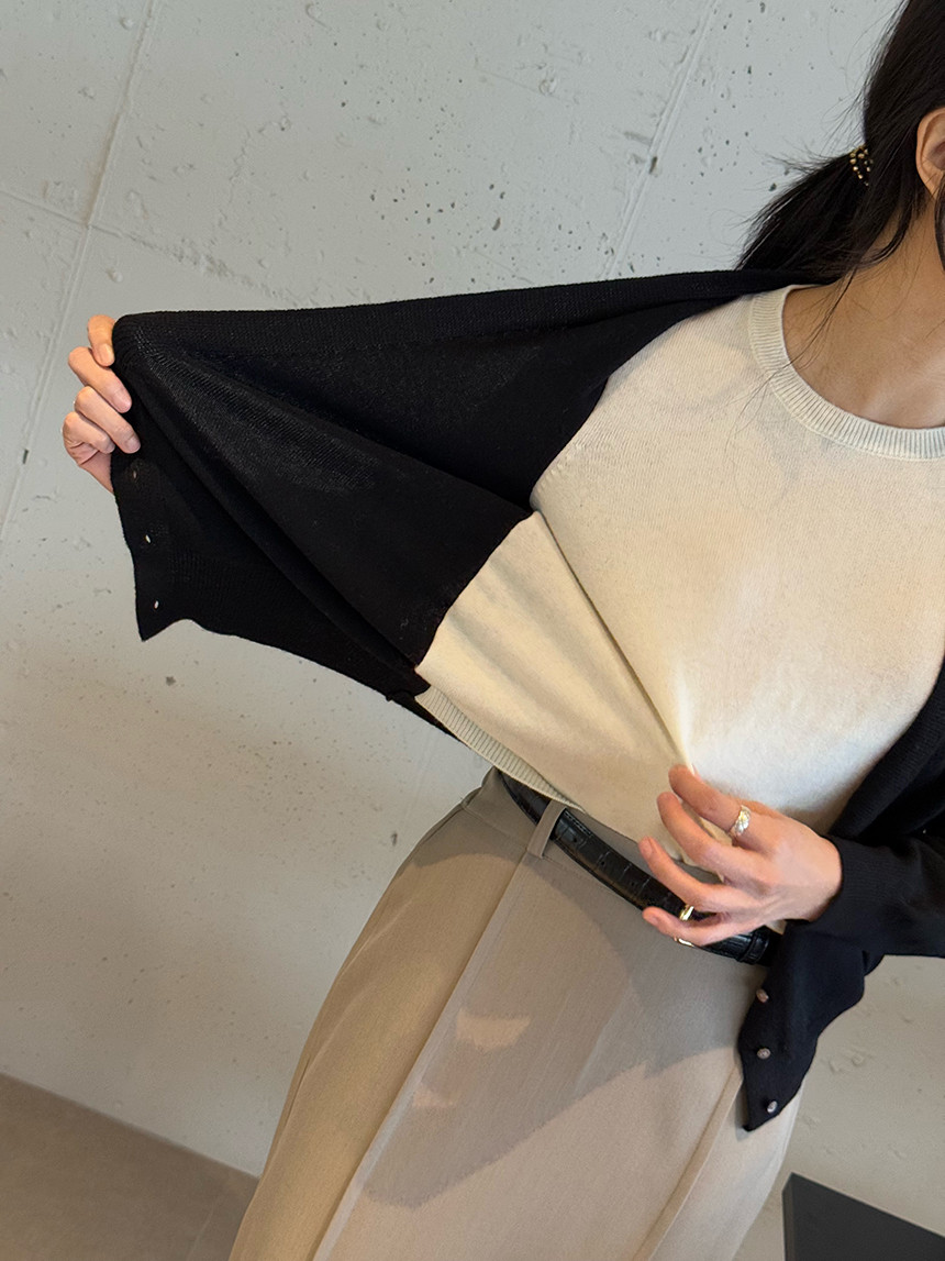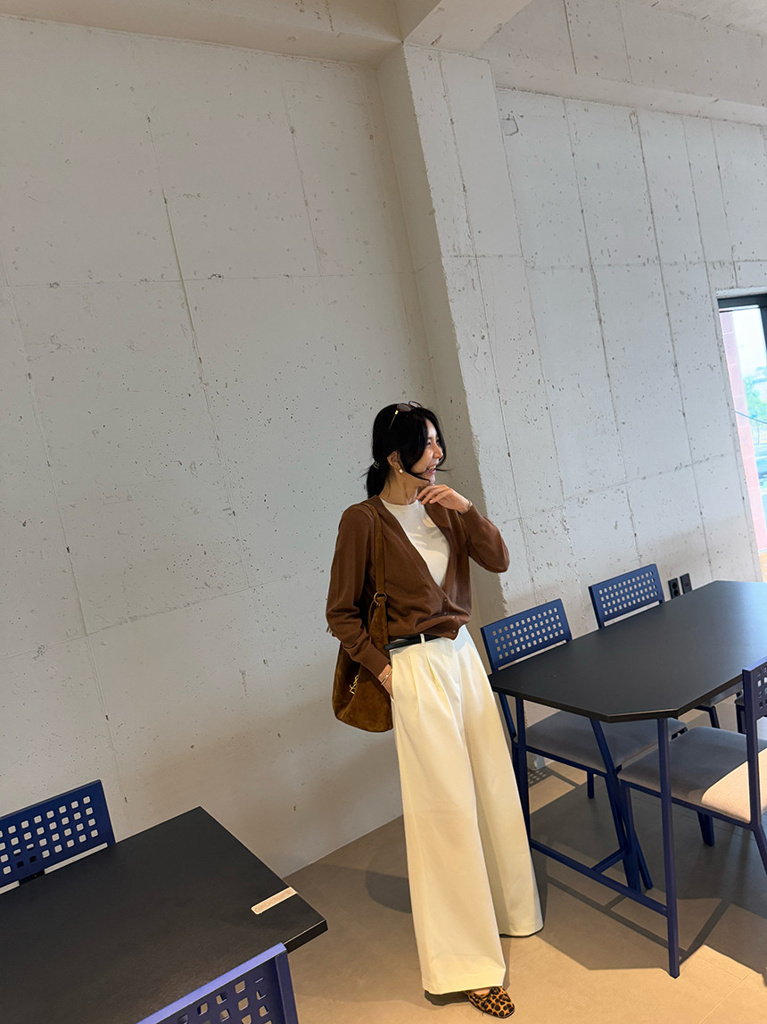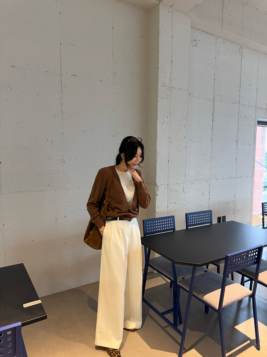 [디테일] 자개단추로 깔끔한 무드 가디건 넥라인이 깊에 파여 날씬해보이는 효과