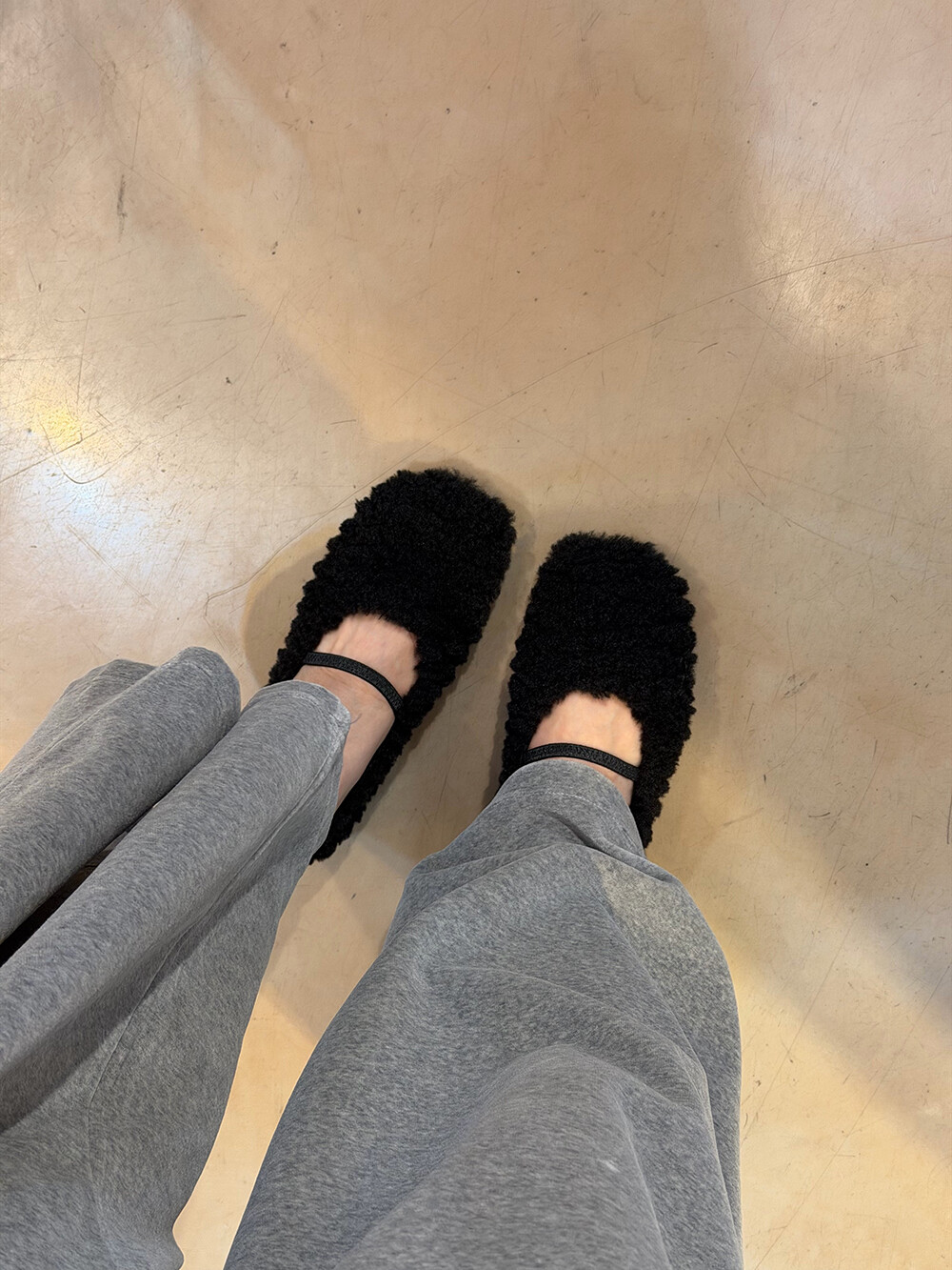 발볼이 넓게 나와 착화감이 편안한 퍼 밴딩 플랫 슈즈예요