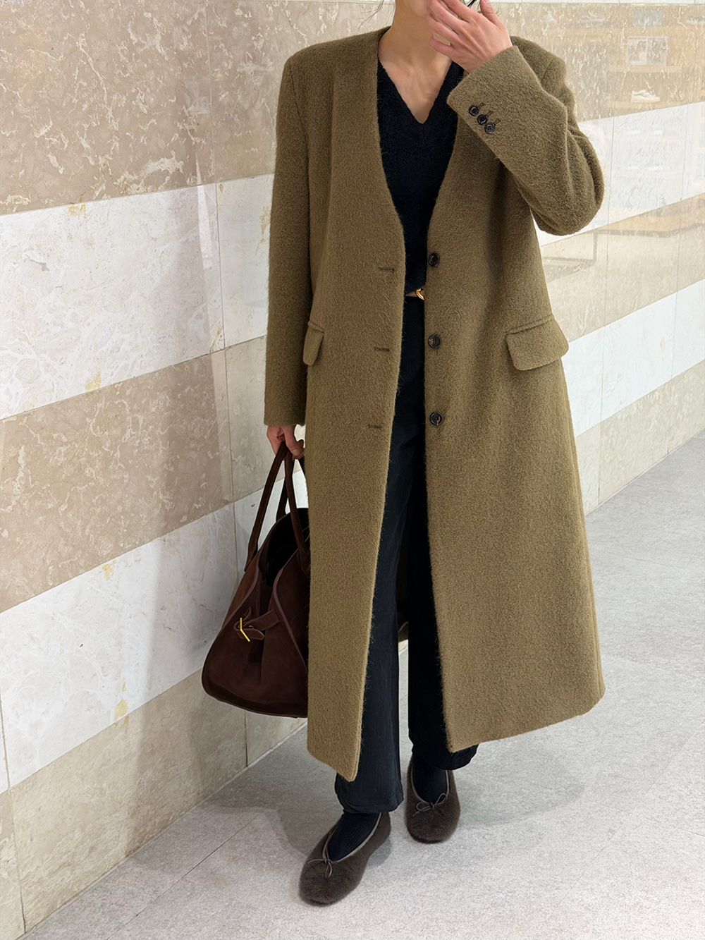 군더더기 없이 딱 떨어지는 핏의 노카라 롱코트예요