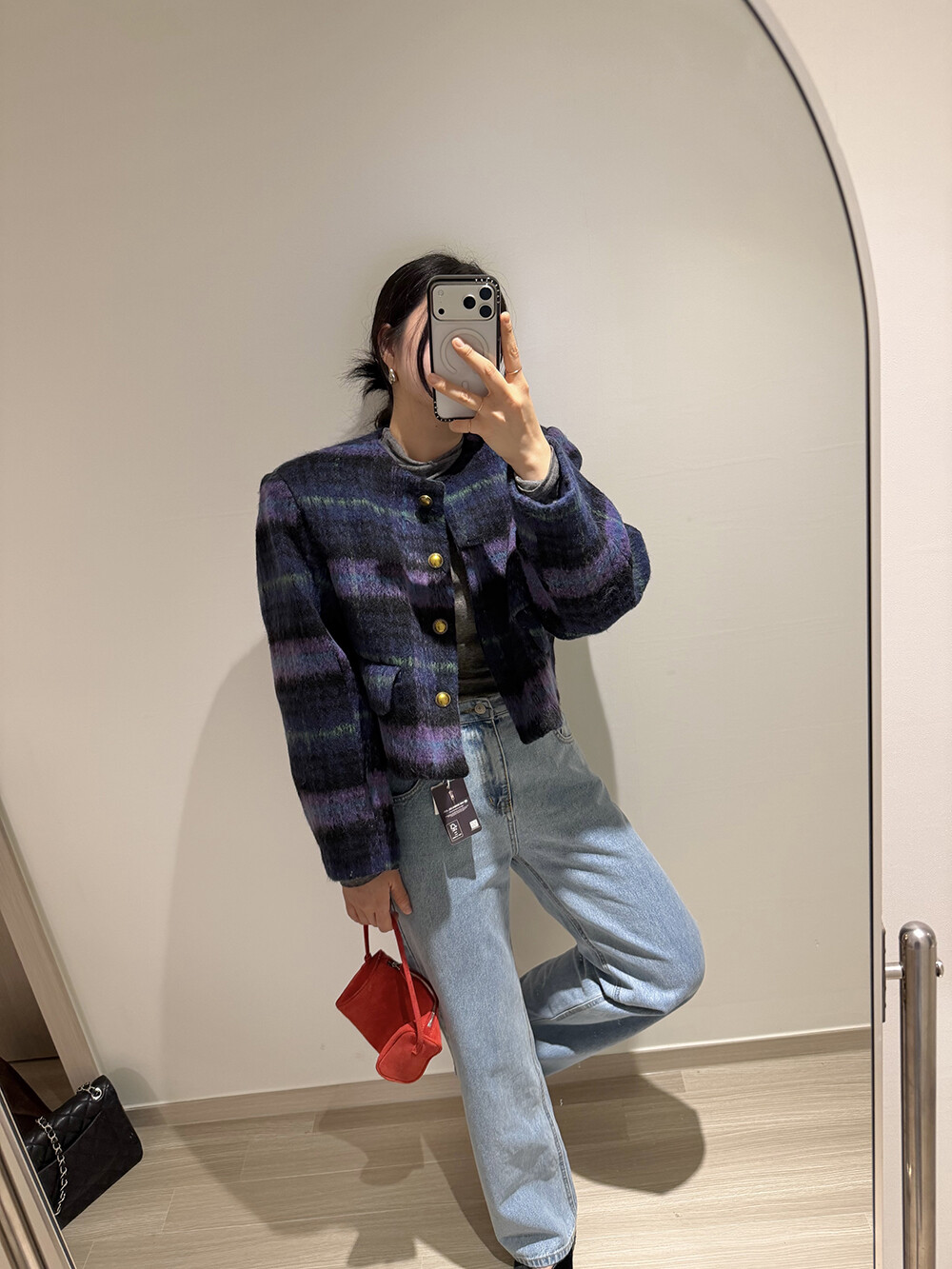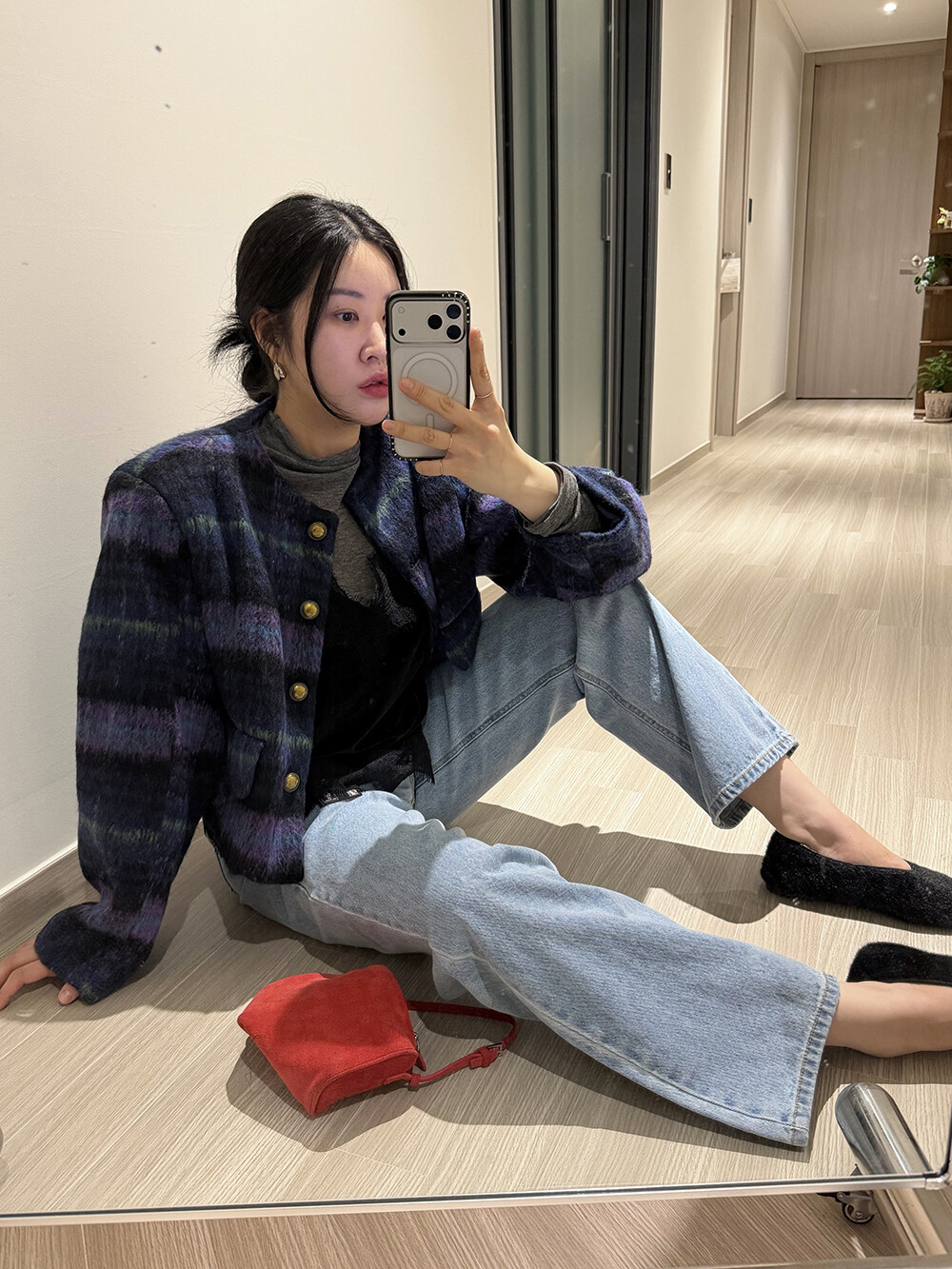 네이비에 퍼플조합💜 거기에, 엔틱한 골드 단추가 더해져 빈티지하면서 키치한 느낌의 체크자켓이랍다