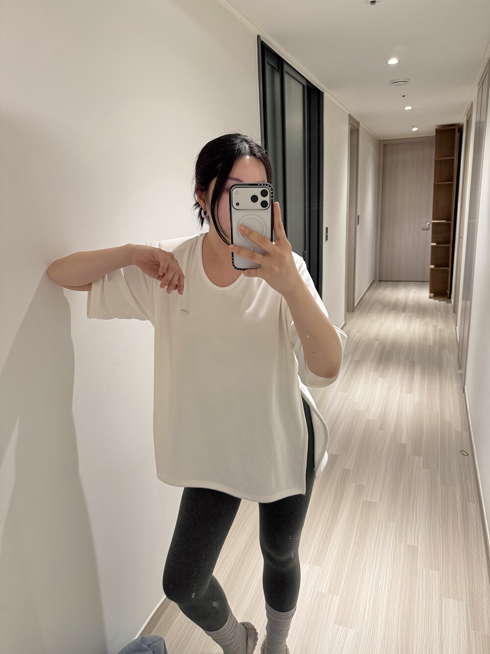 옆트임으로 활동성이 좋으며 힙을 덮는 기장이라 레깅스 위에도 예뻐요