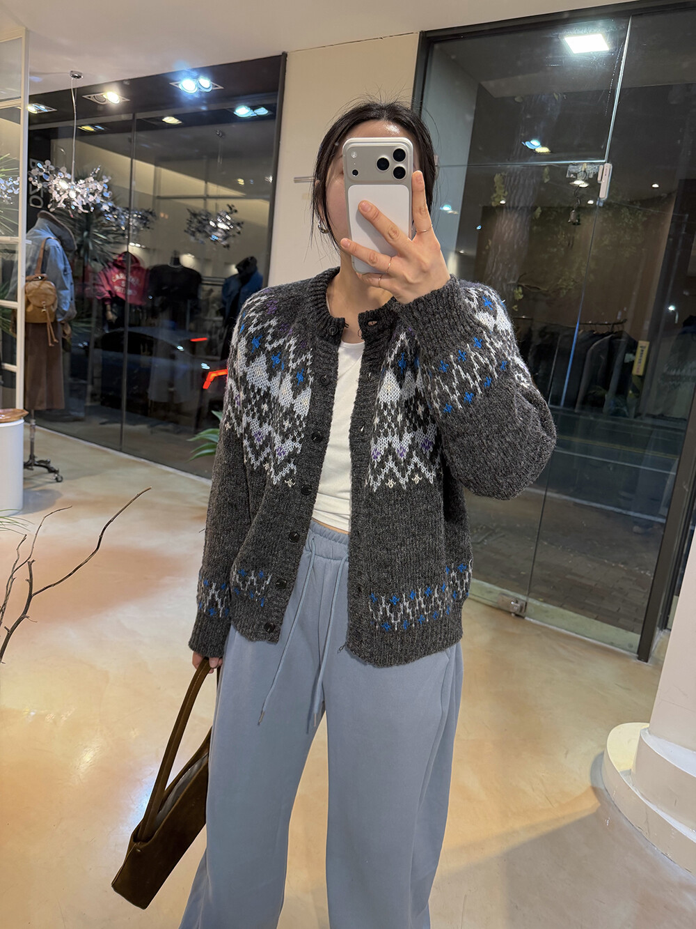 노르닉 패턴의 빈티지한 니트가디건 루즈핏으로 체형 커버되며 여리한 느낌