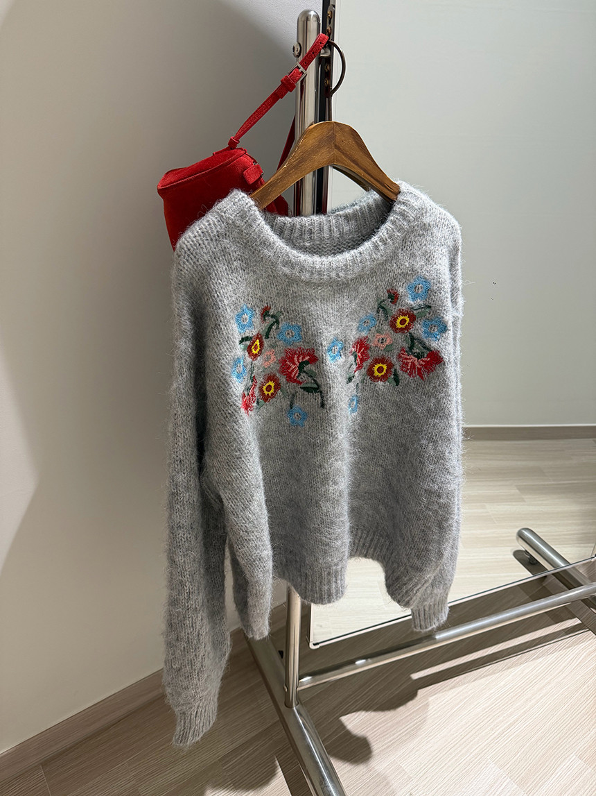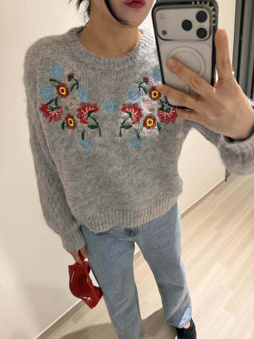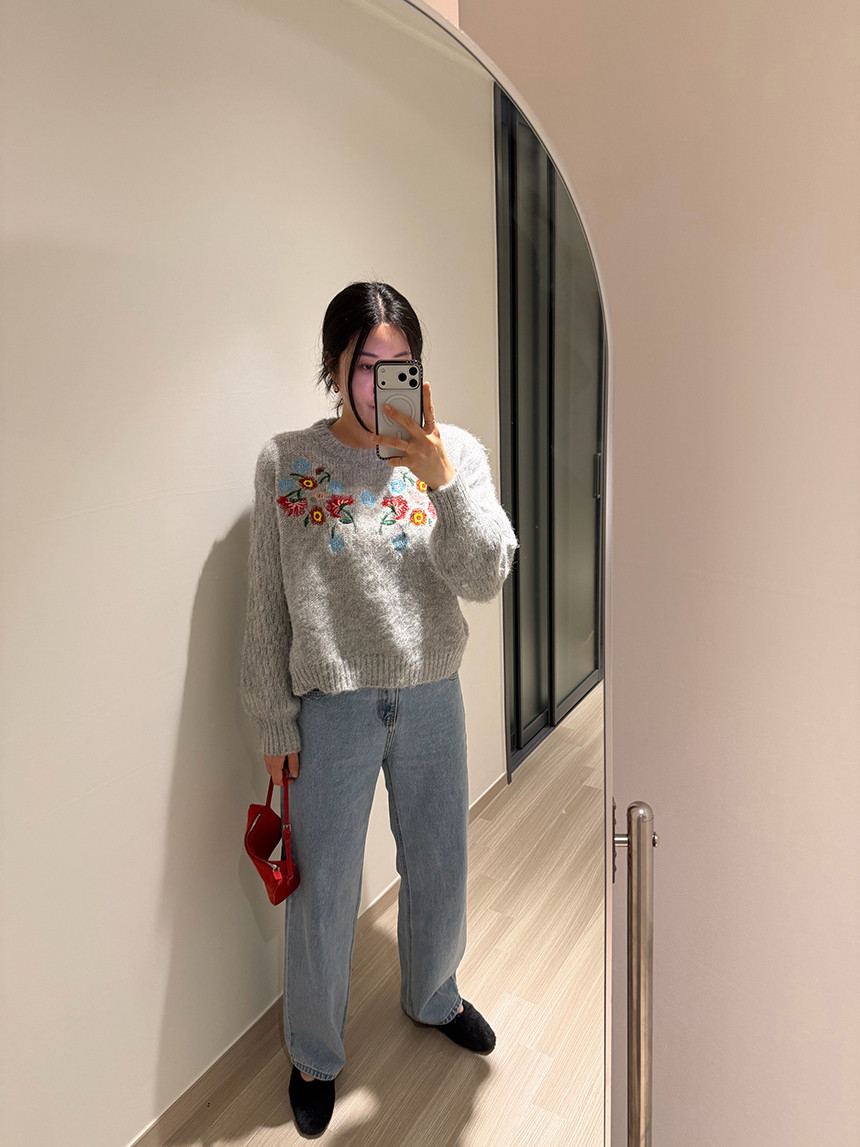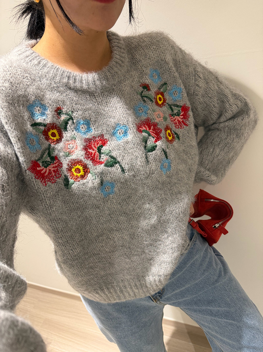 빈티지한 무드의 플라워 자수가 더해진 헤어리한 겨울 니트