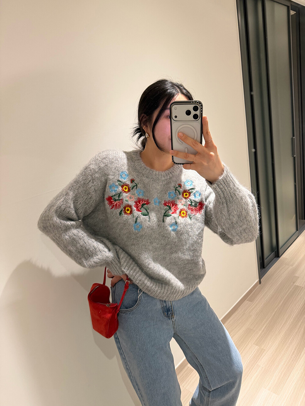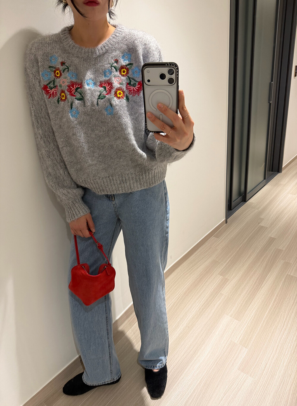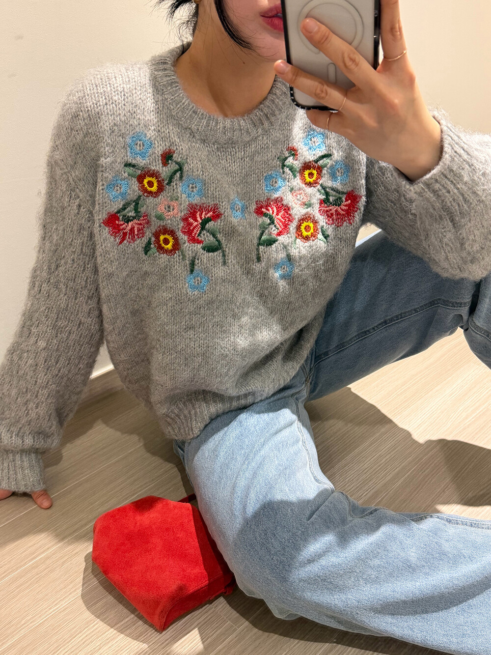 빈티지한 무드의 플라워 자수가 더해진 헤어리한 겨울 니트