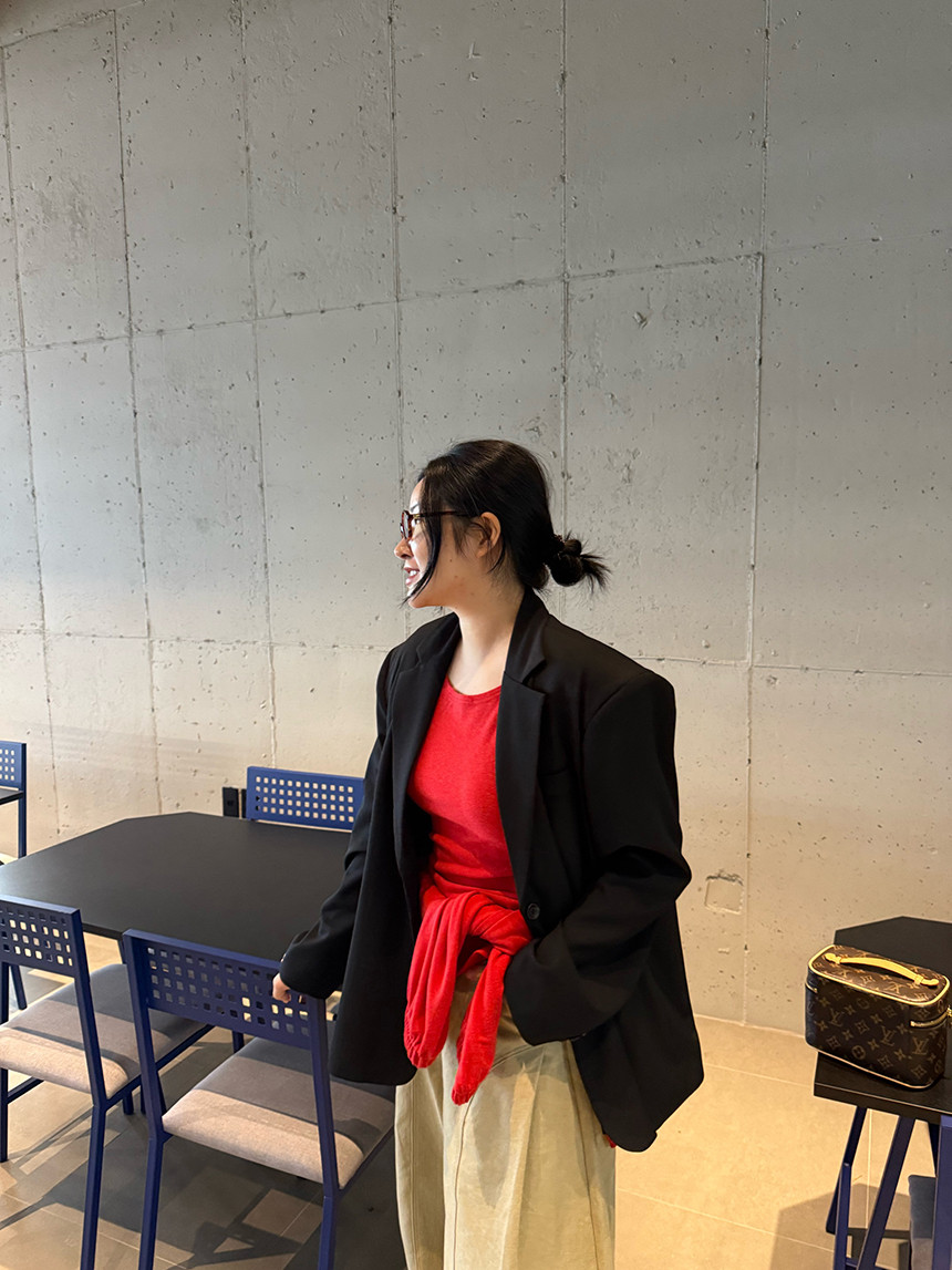 앞 절개 디자인과 오버핏이 만나 드레시한 무드가 느껴지는 가을 자켓 소개할게요