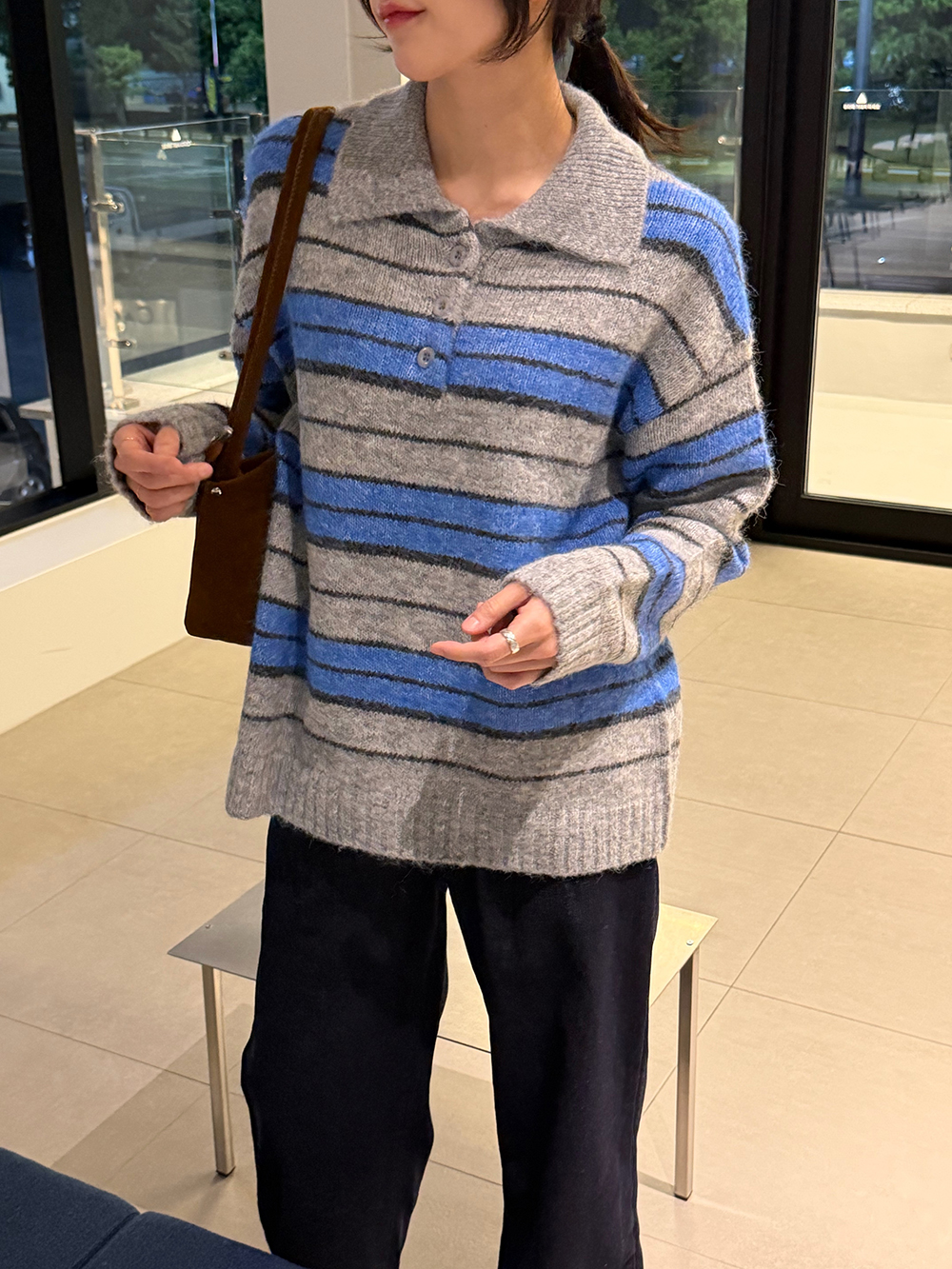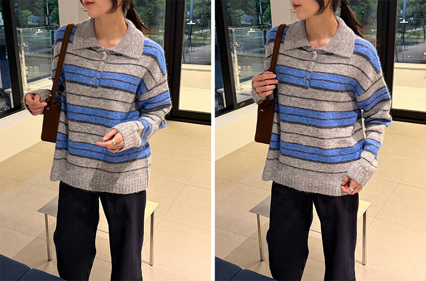 얼굴이 작아보이는 카라 니트 티셔츠에 배색 스트라이프로
