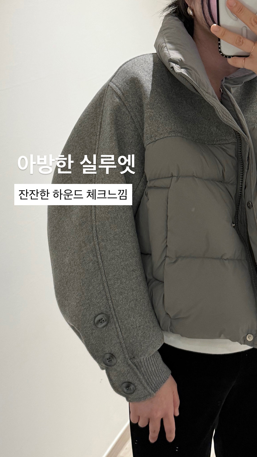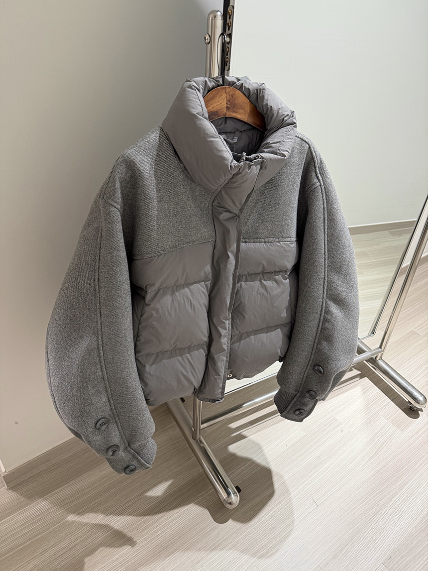 캐주얼함과 보온성을 동시에 잡은 데일리 아우터 울 터치 원단과 패딩이 믹스된 디자인으로 부해 보임 없이 따뜻하게 착용 가능한 아우터